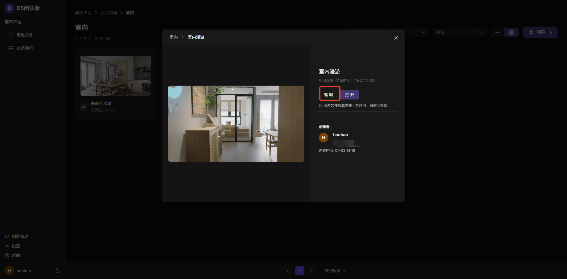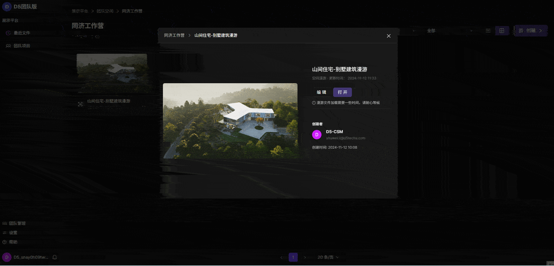 - 团队内任何一个成员都可以向对应的云项目中上传漫游文件;一个漫游文件不可以同时被多个人编辑,如果有其他人正在编辑该漫游文件,另一个人无法编辑该文件。