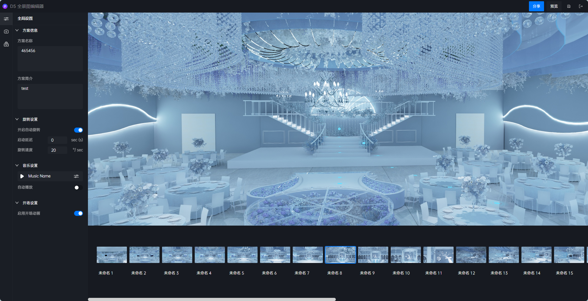 选择音乐开启自动播放后,您分享的全景图链接在打开后会自动播放音乐;我们提供的默认音乐全部拥有可商用的公版协议。 - 开场设置: