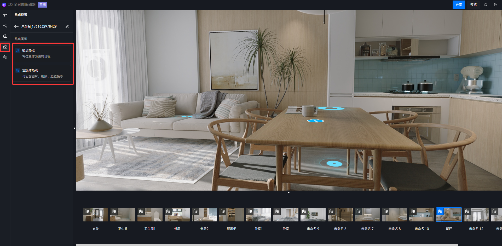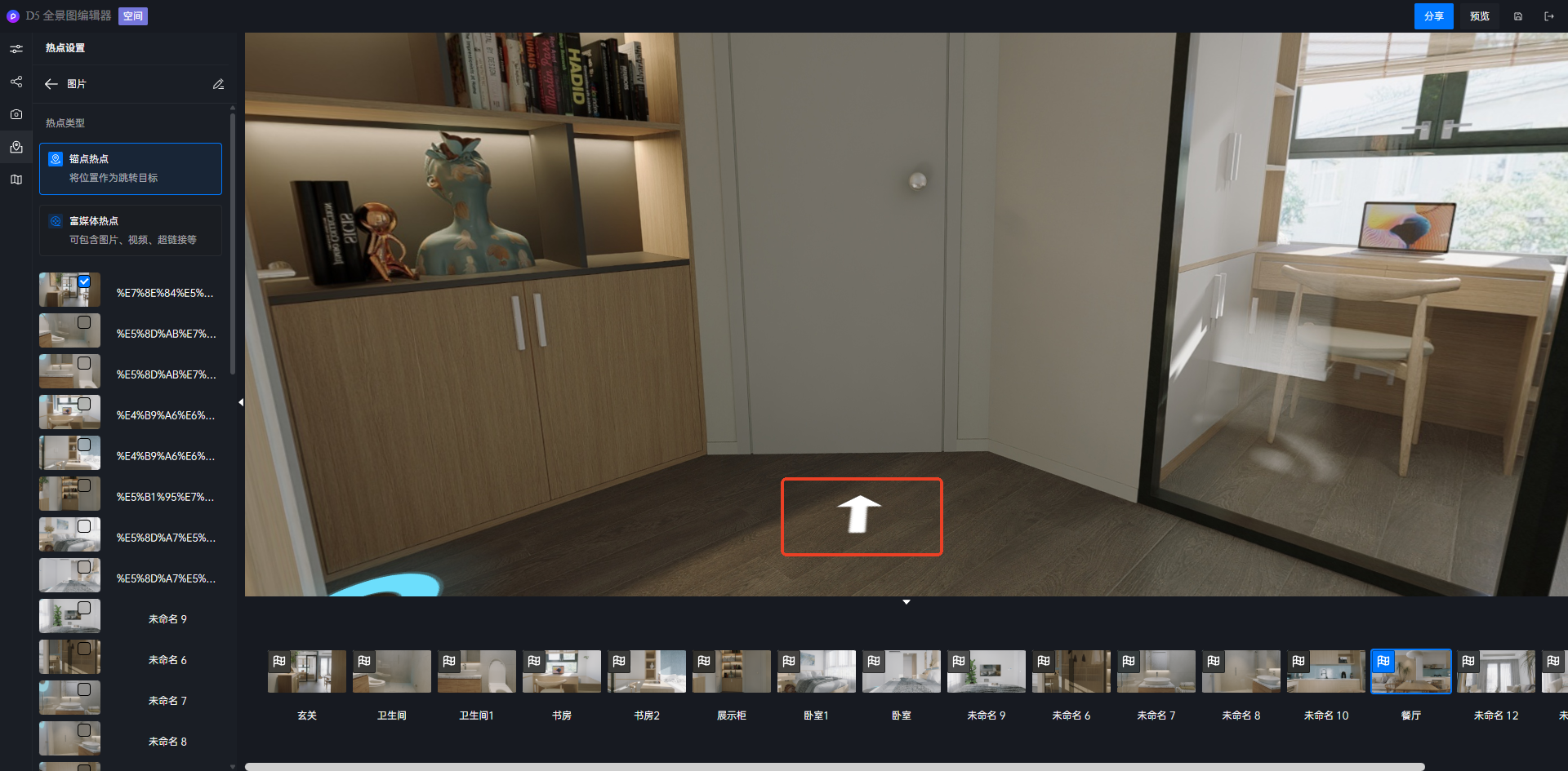 - 上传成功的漫游点击编辑后会进入全景图编辑器,用户可以在编辑器中对漫游的分享做二次编辑。