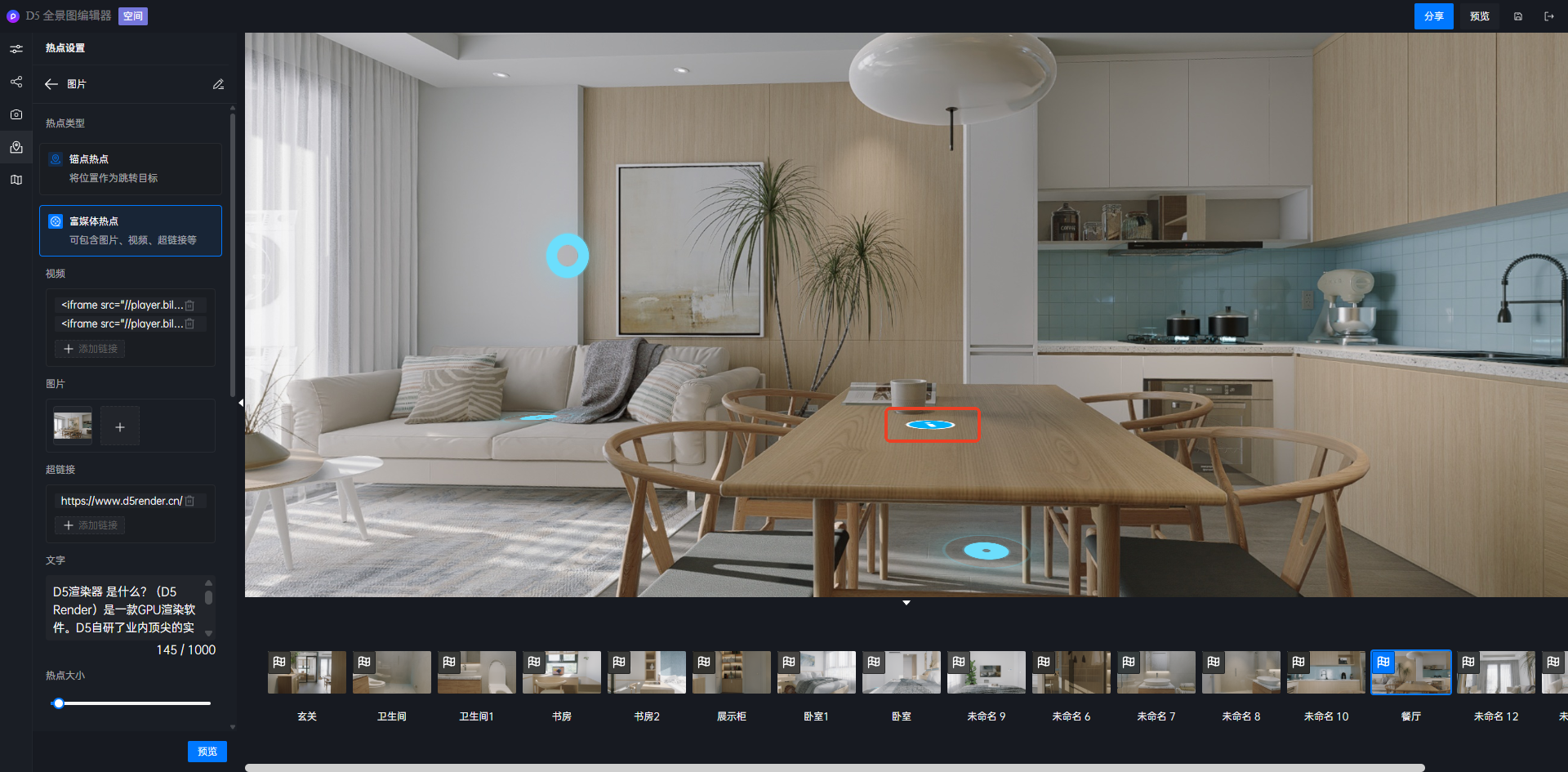 绑定一个当前漫游全景图序列中的全景图场景。点击该类型的热点后会跳转另一个全景图;