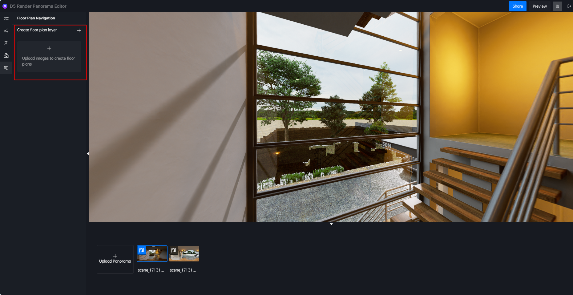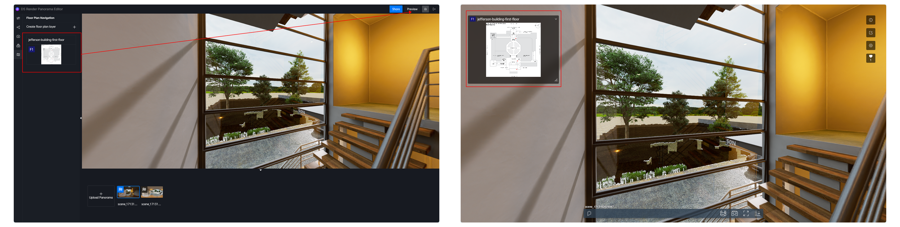 - 上传完成后点击预览,全景图的左上角会出现平面户型导航