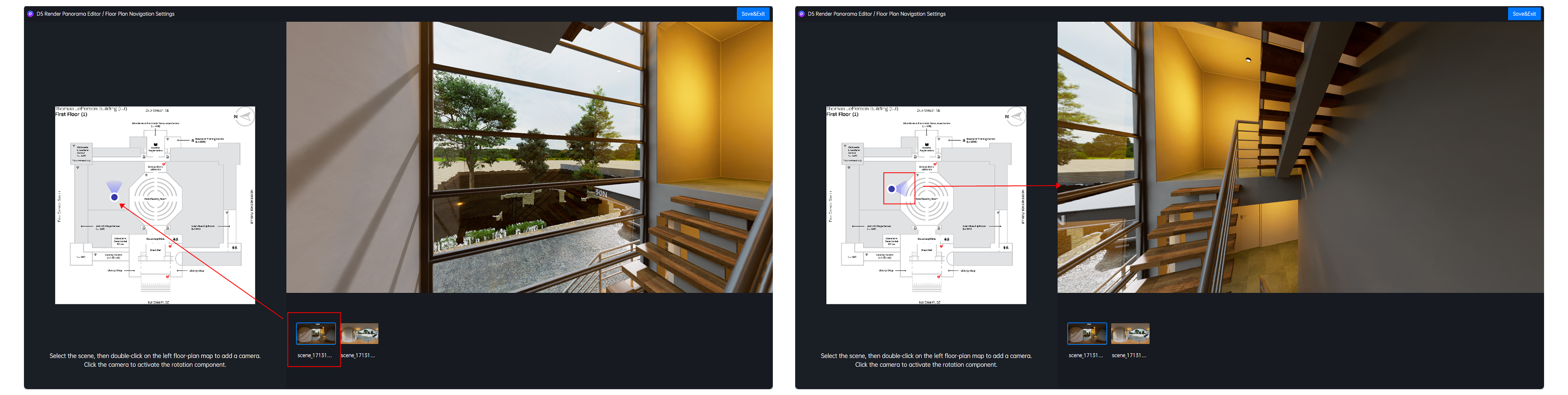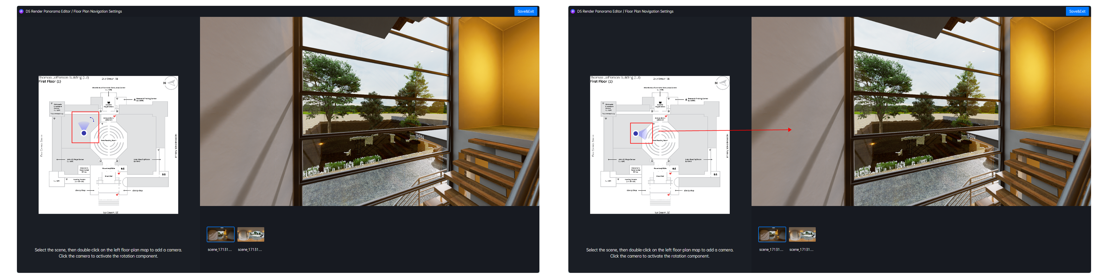 - 默认的小相机朝向如果不符合当前全景图的实际朝向,您可以单击对应的小相机,会出现一个旋转组件。使用旋转组件,可以单方面调节小相机的朝向、同时不改变全景图的当前朝向。