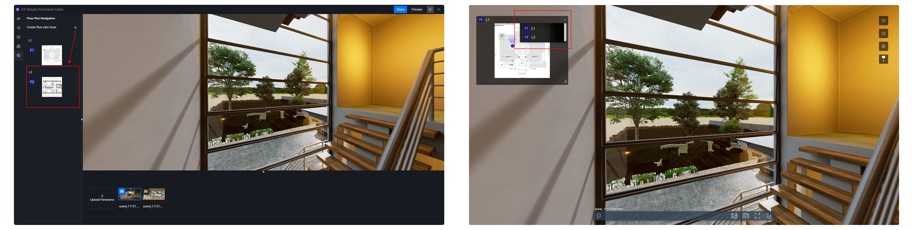 - 如果您的项目是一个多层建筑,您可以创建多个楼层的平面导航,在全景图链接中,被分享者可以在地图导航组件中通过下拉选择器切换不同的楼层进行切换。