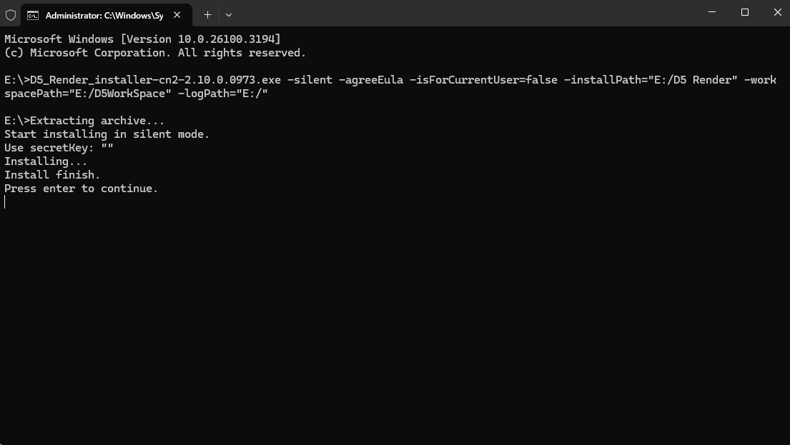 D5_Render_installer-cn2-2.10.0.0973.exe -silent -agreeEula -isForCurrentUser=false -installPath="E:/D5 Render" -workspacePath="E:/D5WorkSpace" -logPath="E:/"