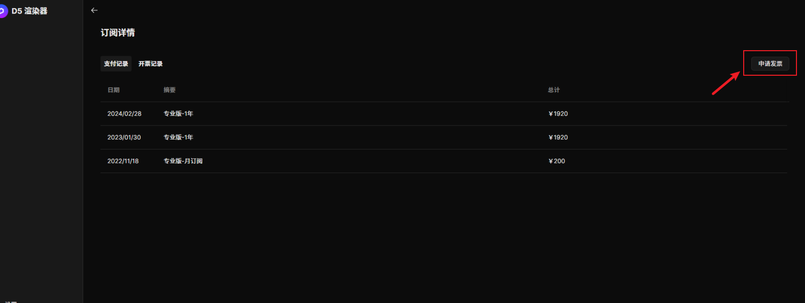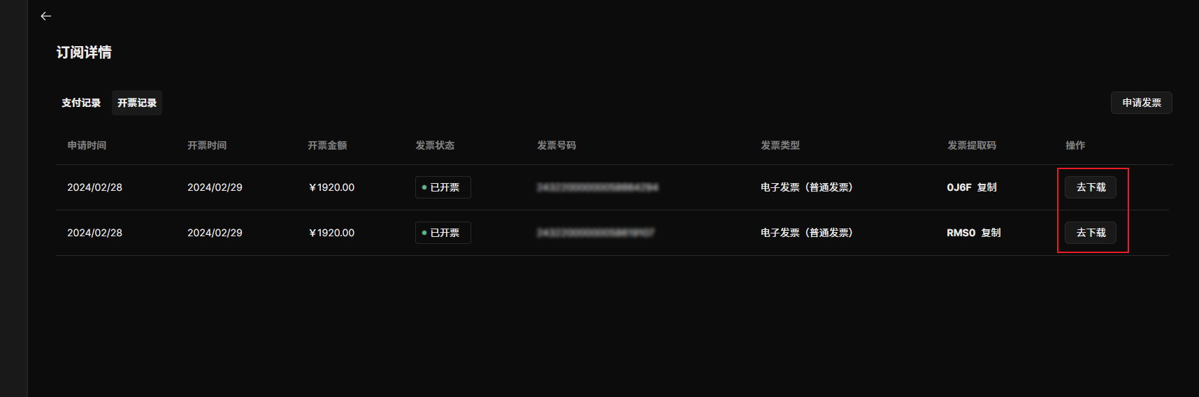 请在【个人中心】-【订阅计划】-【订阅详情】中查看发票历史以及申请发票。