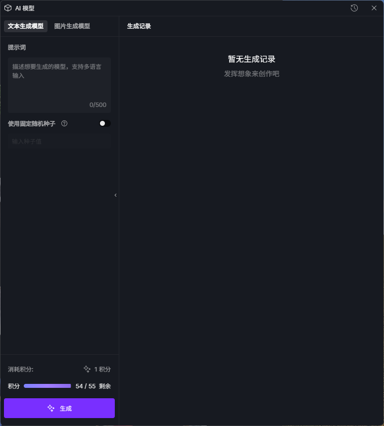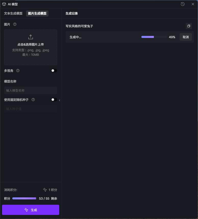 - 积分消耗: 每次生成任务都会消耗一定数量的积分。