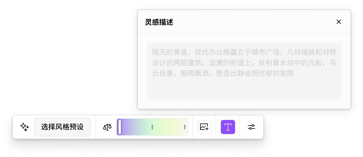 - 每个项目类型中有更详细的设计风格,从视角、环境、季节、材质等多个方面,对设计风格做了具体的描述,可以进一步选择对应的生成风格