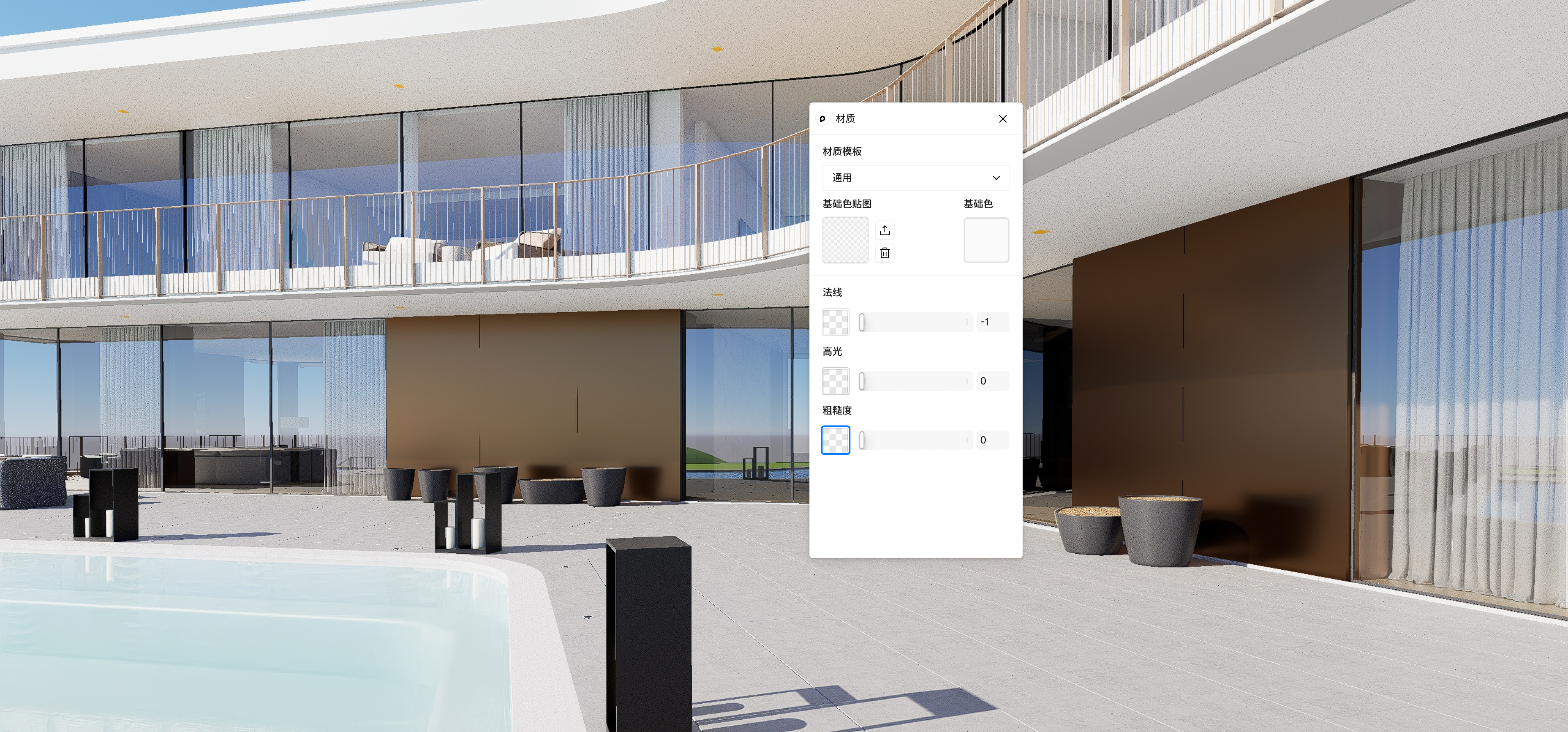 - Lite 与 D5 渲染器一致,支持 PBR 系统材质。但 Lite 中仅继承了 SketchUp 中单张基础色贴图的特性,对于其他 PBR 通道,仅支持调整通道参数,简化了调节方式,也提高了渲染性能。