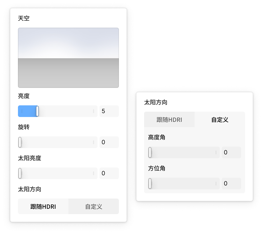 - a 支持开启太阳亮度参数,补充 HDRI 的照射亮度 b 太阳方向默认跟随 HDRI 的最亮点。支持切换未自定义方向,调整太阳的高度角和方位角