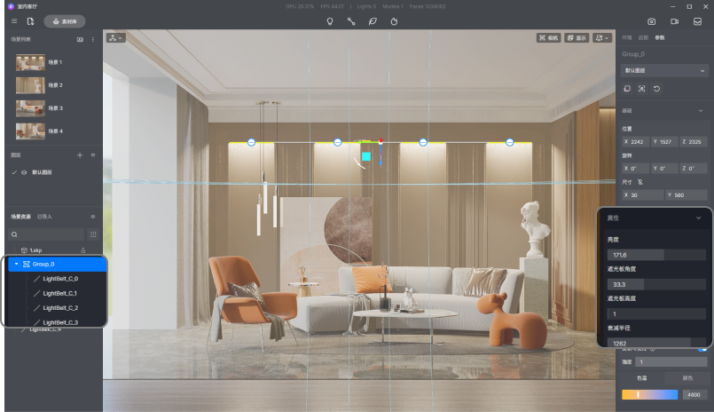 将同一类型的灯光(点光源/聚光灯/灯带/区域光/舞美灯/投影仪)成组后,灯光的参数自动关联。在场景或者列表中选中灯光组时,右侧边栏会自动显示该类型光源对应的参数,以便进行统一调整。