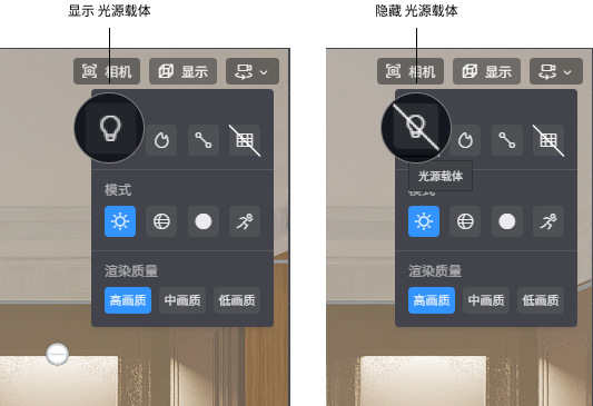 在视口的右上角导航栏中选择“显示” > 在下拉面板中选择光源的图标