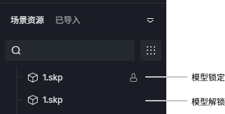 在D5渲染器中,从欢迎页打开的模型,在场景中默认为锁定状态。在场景中导入的模型默认为非锁定状态。