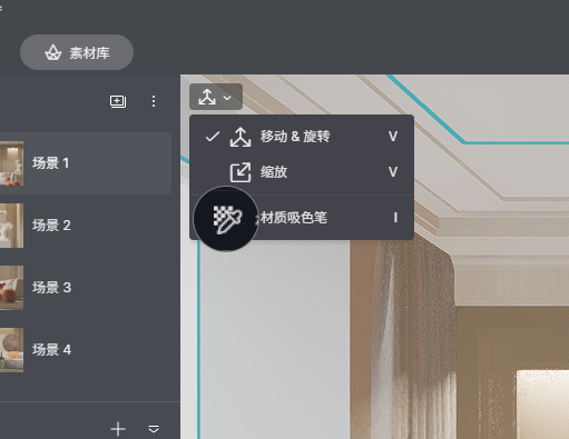 当模型在资源列表被锁定时,直接选中场景中的材质就可以对材质进行编辑。 如果模型没有锁定,可以使用快捷键 I 使用材质吸色笔,吸取场景中的材质进行调节。