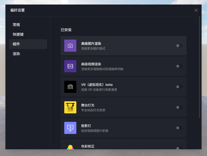 在左上角菜单栏-偏好设置-组件,打开高级视频渲染的开关。