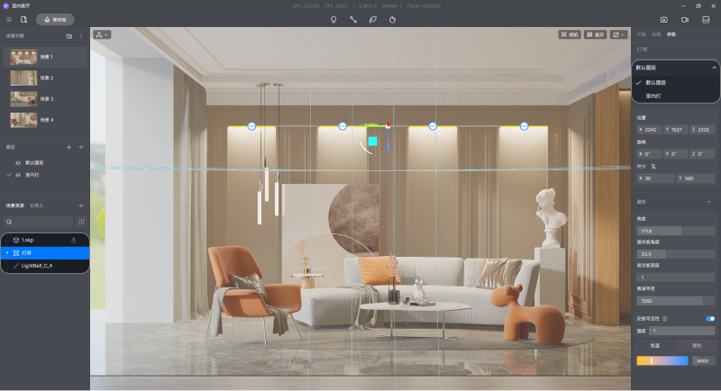 场景中或者在场景列表中选择物体,在右侧边栏中物体名称下方会显示物体所在的图层,下拉菜单即可对物体所在的图层进行切换。