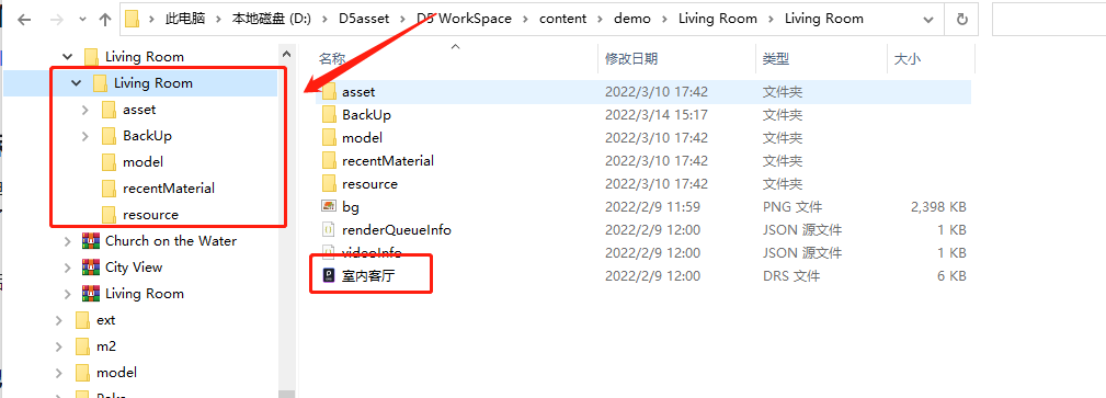 如:drs文件的路径为:D:\D5asset\D5 WorkSpace\content\demo\Living Room\Living Room