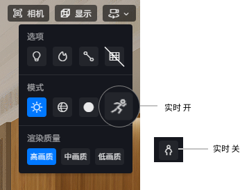 “实时”按钮控制是否预览场景中动态元素的运动效果。 在实时模式下,