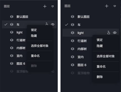 图层支持锁定、隐藏功能。图层锁定后,图层中的所有物体都会处于锁定状态。处于隐藏状态的图层,其中的所有物体也会被隐藏,新添加到该图层中的物体,也会立即被隐藏。在图层的右键菜单中,点击“选择全部对象”,可以一次全选当前图层中的所有物体;点击“重命名”,可以更改当前图层的名称;点击“删除”,可以删除当前图层和图层内的对象。