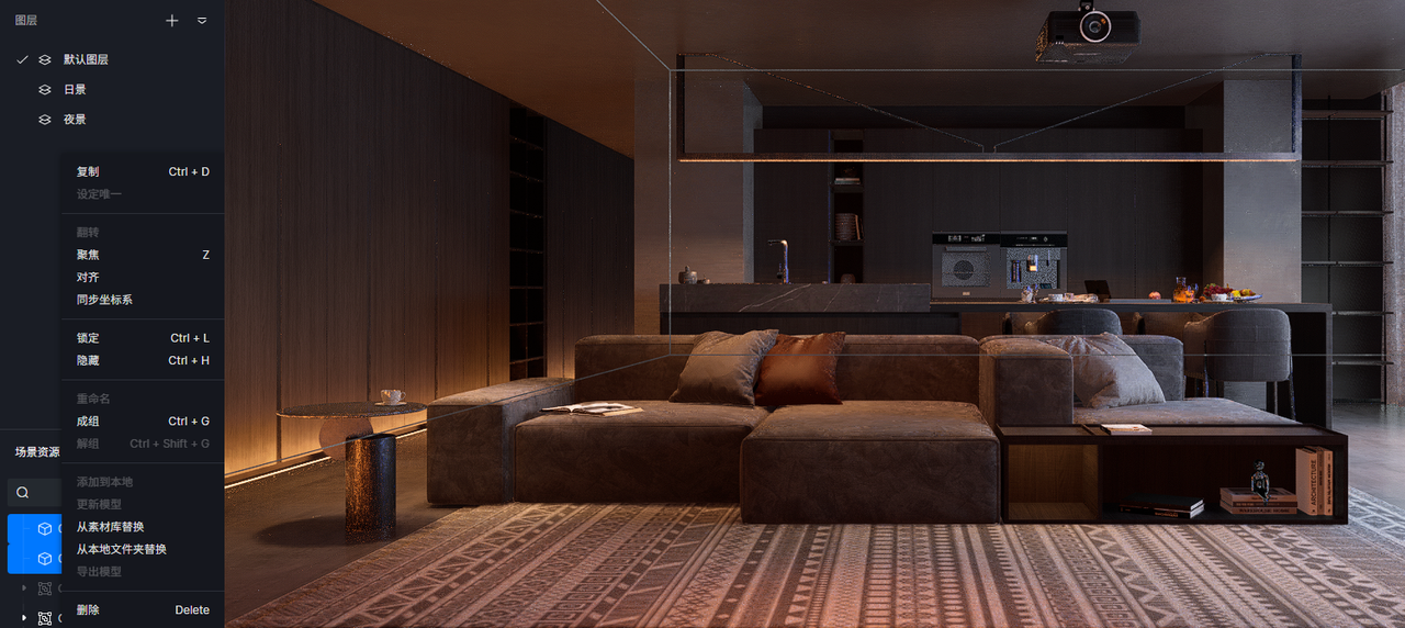 如果模型来源于不同的模型文件甚至是不同的建模软件,可以使用“同步坐标系”的功能,将模型直接恢复到绝对建模坐标的位置。左侧导入模型的资源列表菜单同步此功能。
