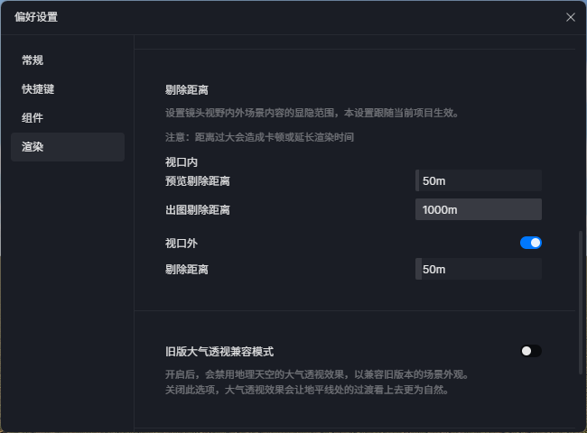 视口外剔除距离:用于控制相机视野外内容的显示范围,对实时预览和渲染输出/视频均生效。