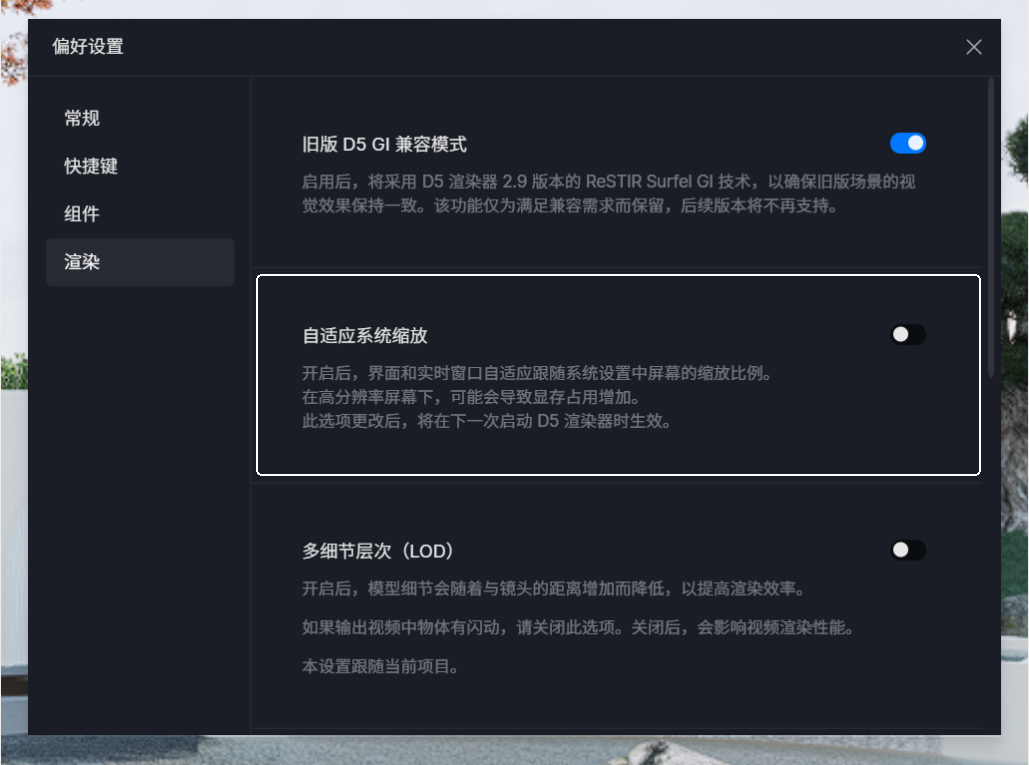 在“偏好设置” - “渲染”选项中,可以设置实时预览窗口是否跟随屏幕比例缩放。未开启时为固定分辨率。开启后,预览窗口的分辨率,会自适应系统设置中屏幕的缩放比例。