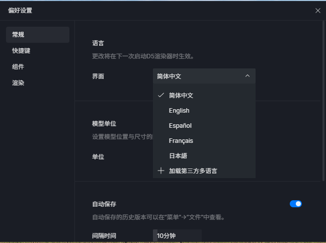 目前支持 简体中文、English、Español、Français、日本語,更改语言后将在下一次启动D5渲染器时生效。