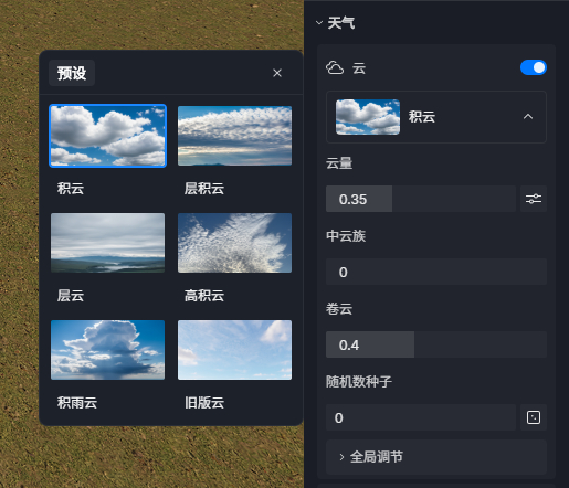 | 云量 | 控制天空中云的面积和体积,数值越大,云量越多 |