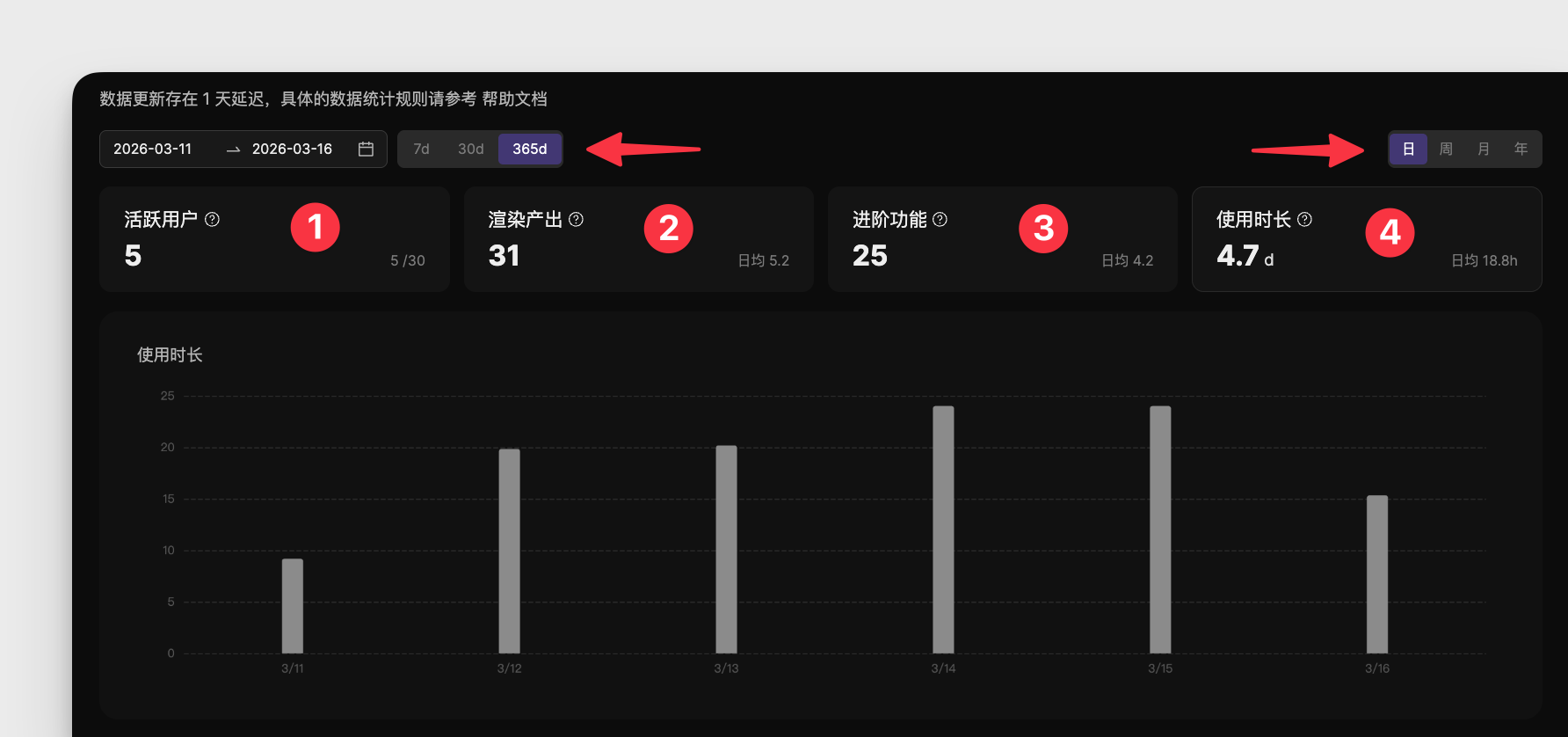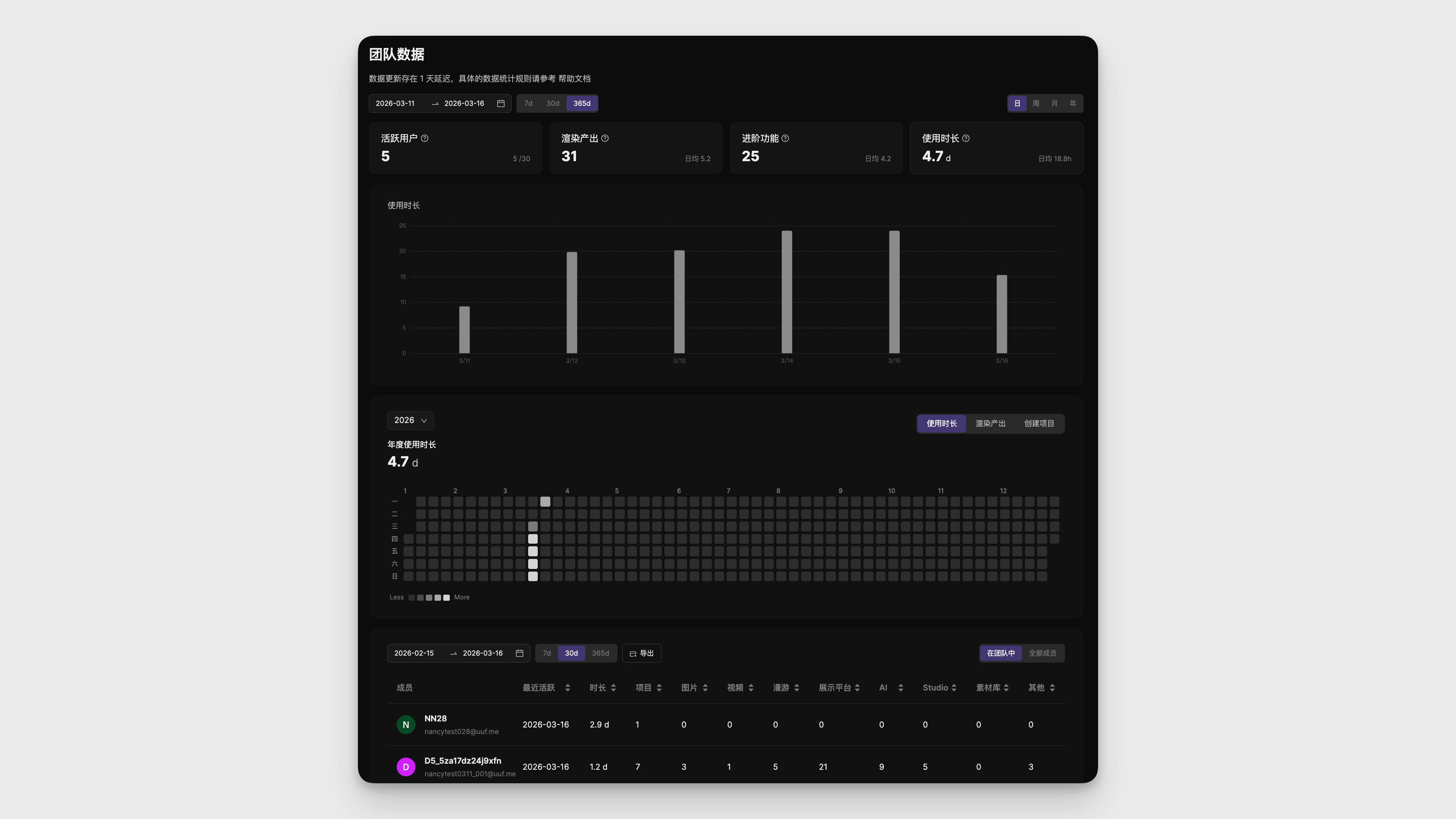 统计内容: 团队成员在所选时间段内累计渲染的作品数量,包含图片、视频、漫游和展示平台。