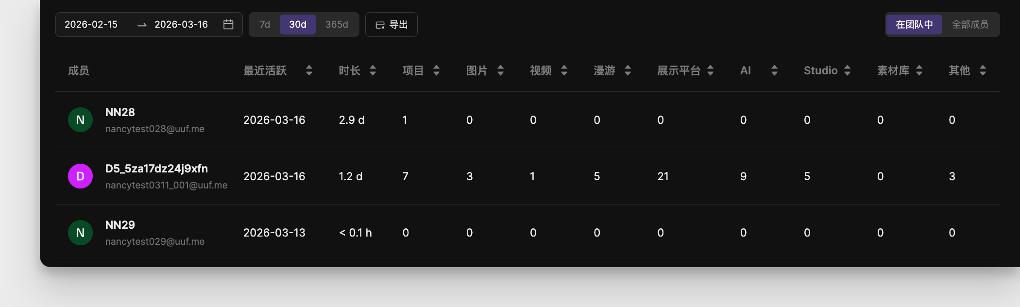 - 筛选: 可切换查看"当前团队成员"(默认)或"全部成员"(包含已移除的成员)。已移除的成员以灰色置灰显示。
