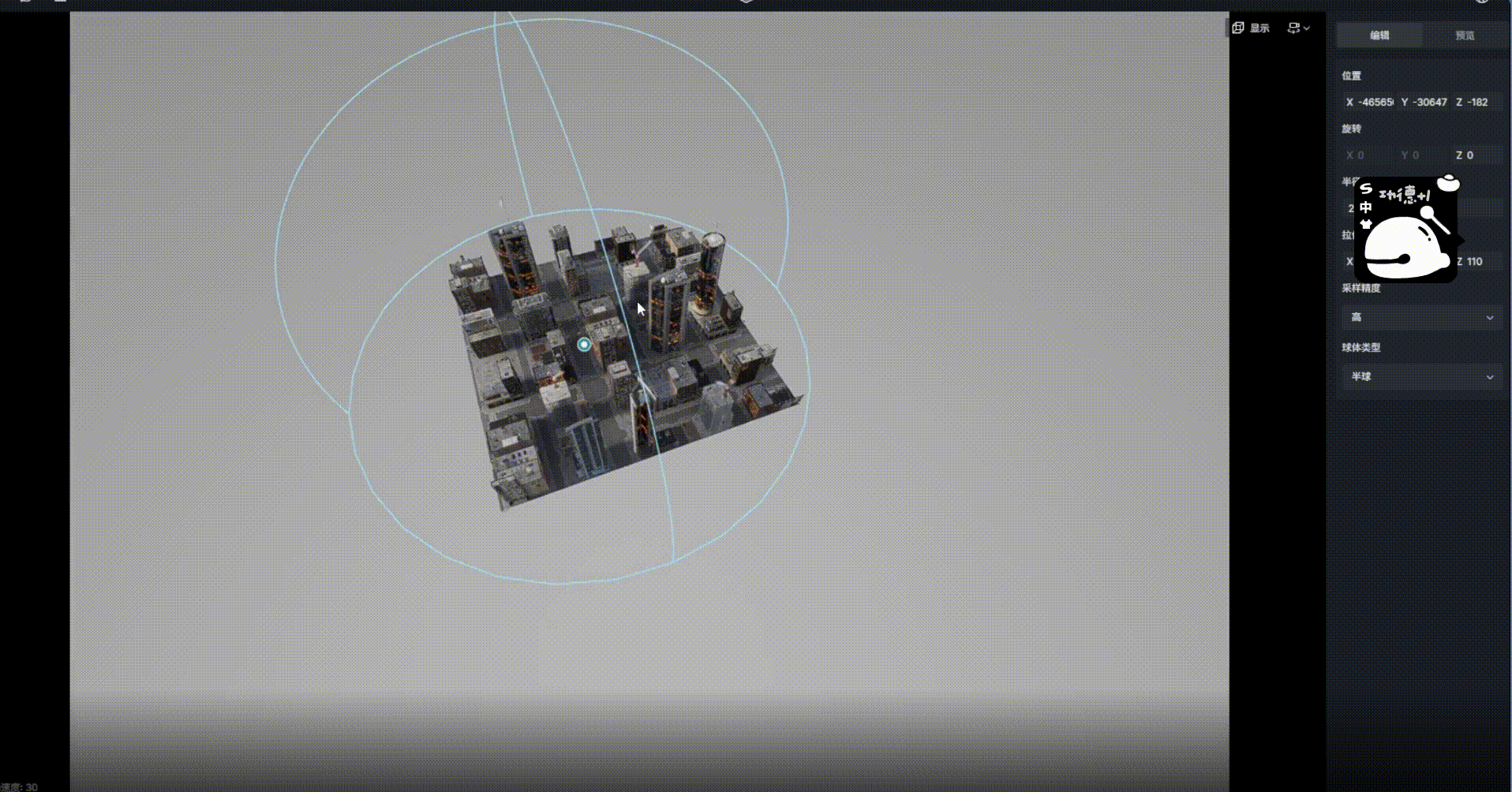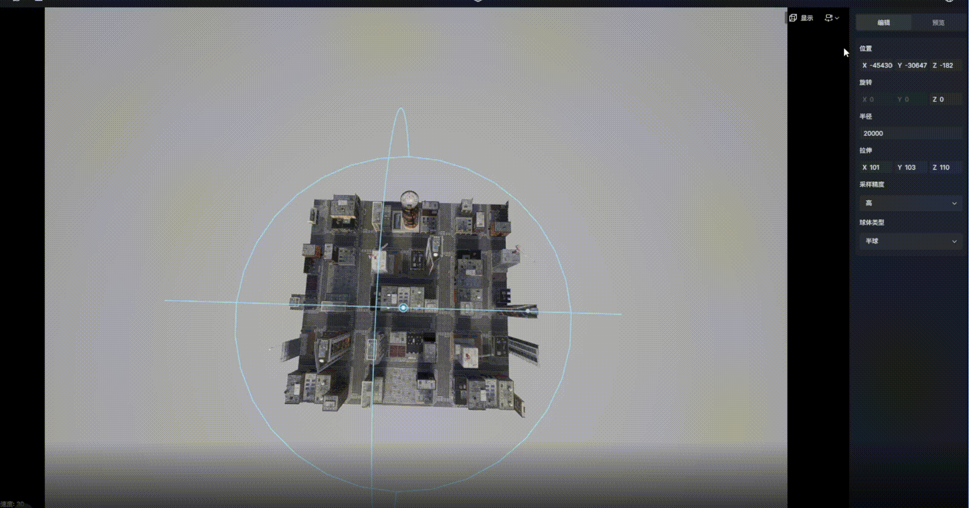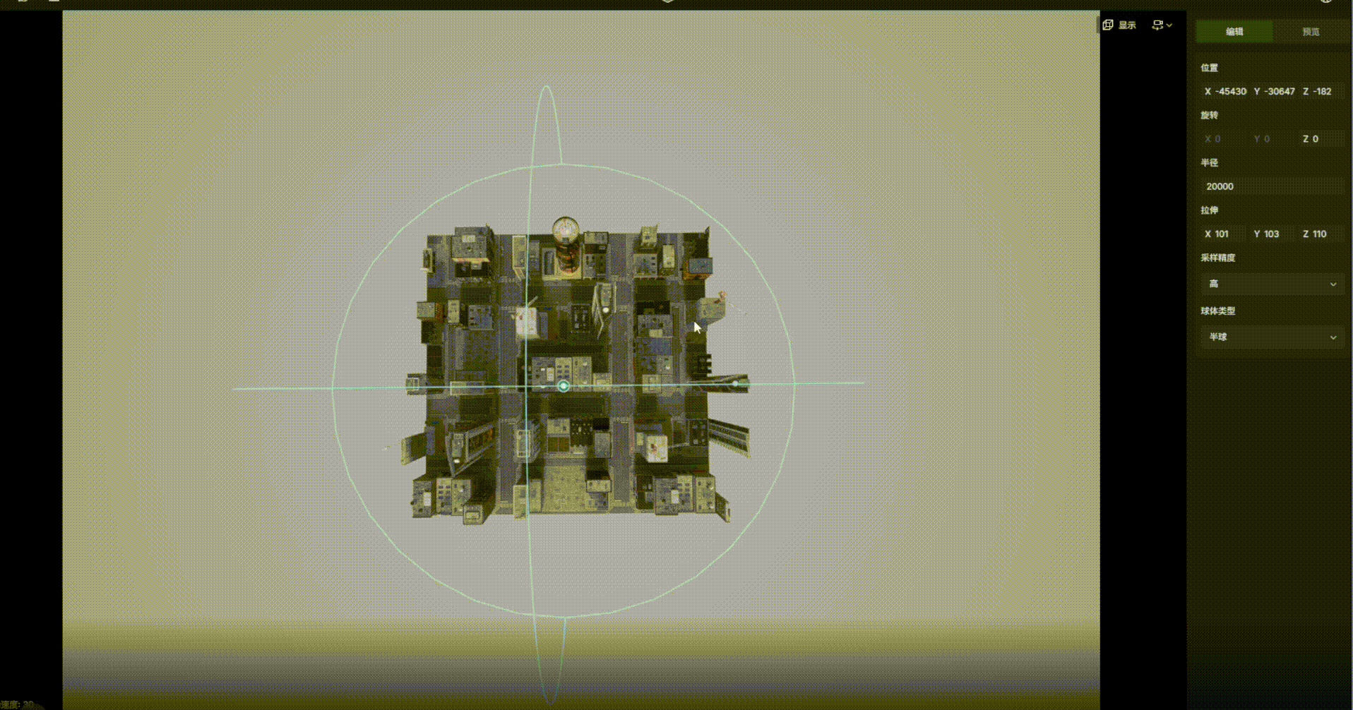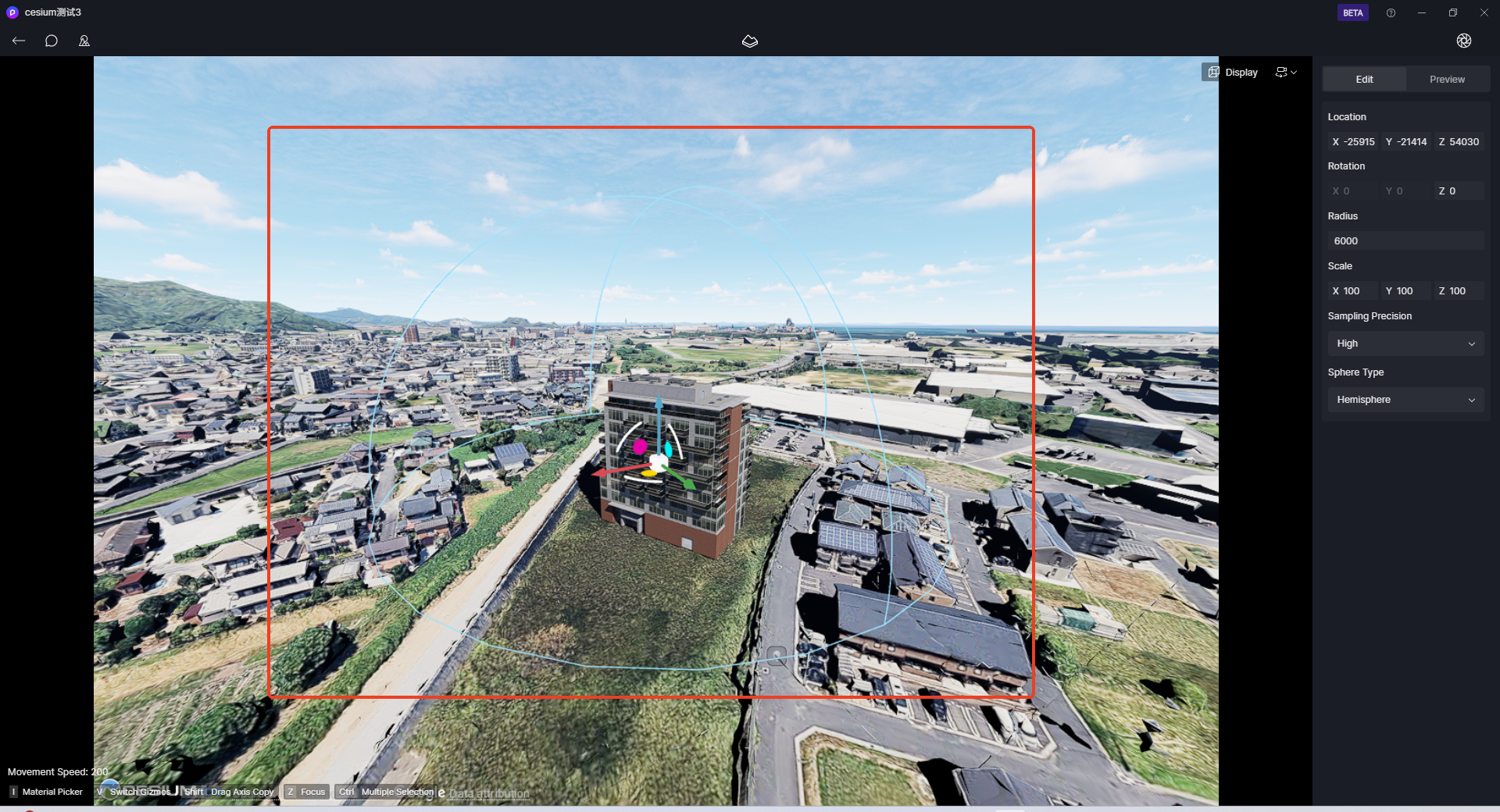 2. 选择半球形相机矩阵模板的中心,并通过gizmos组件调整合适的位置