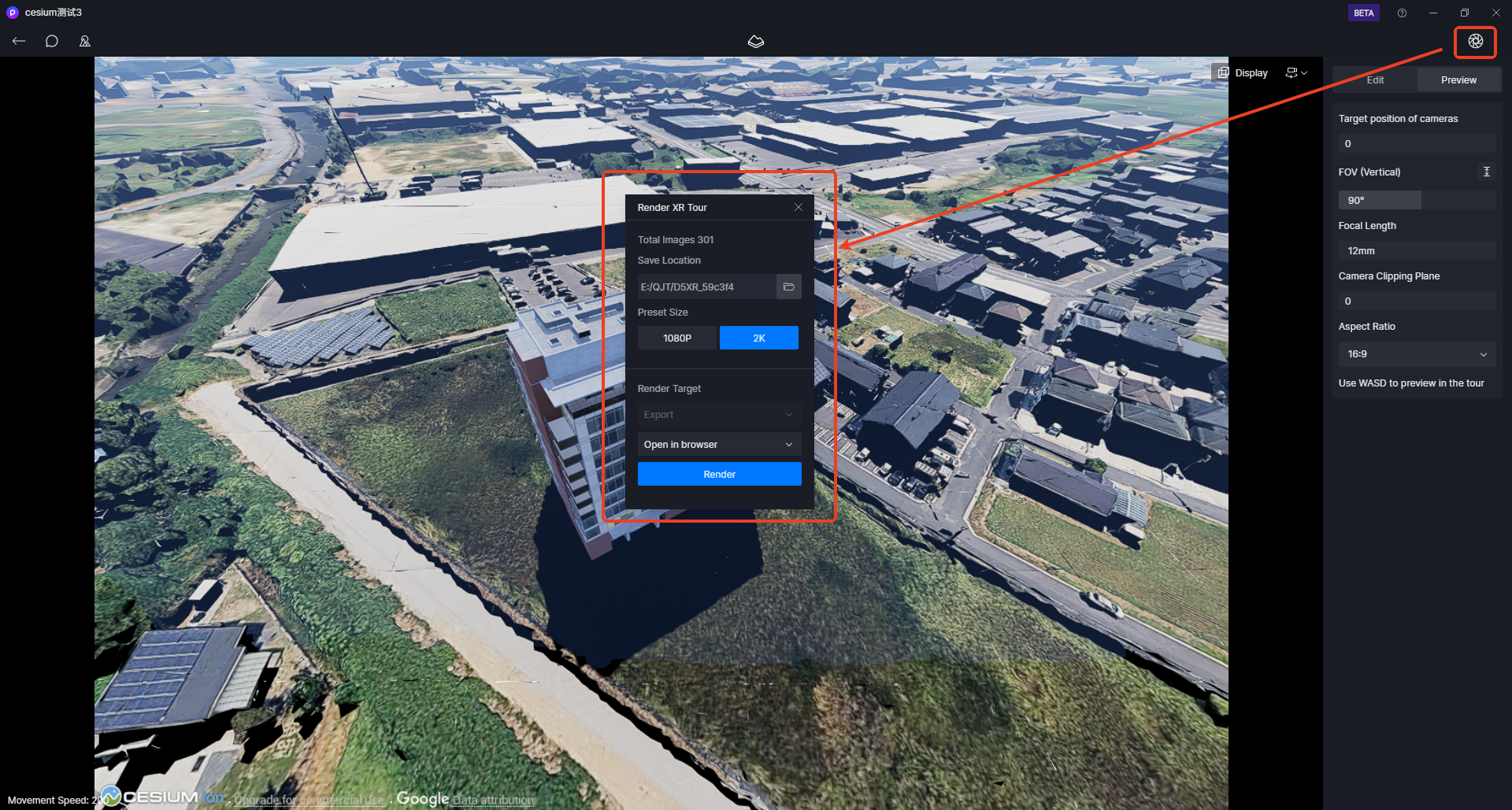 5. 调整好拍摄的细节后,点击渲染出现渲染设置的弹窗,选择储存位置和分辨率后点击开始渲染。