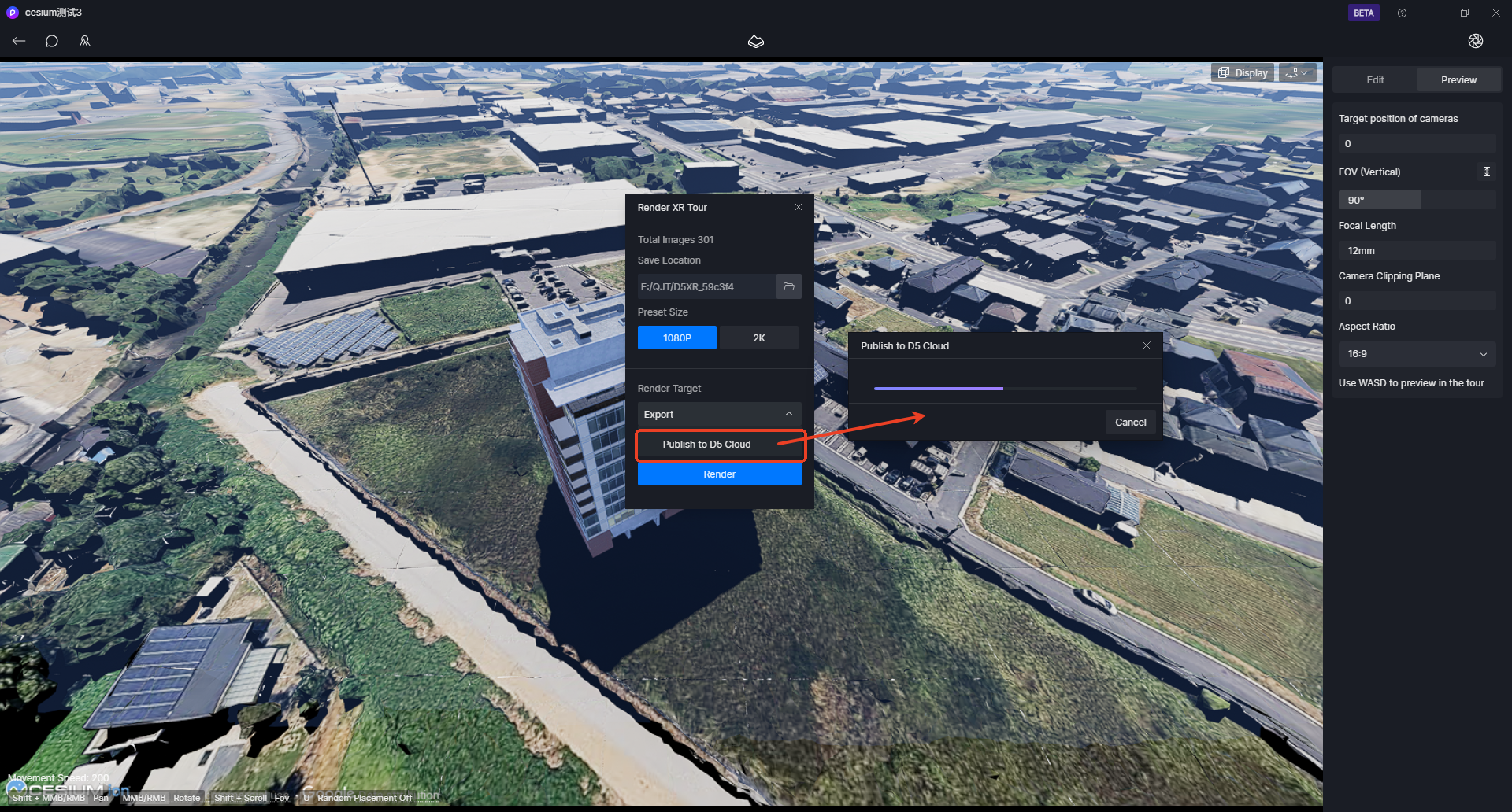 5. 完成渲染后,点击发布到D5 Cloud,客户端会将本地的文件上传到云项目中,投递一个机器学习训练