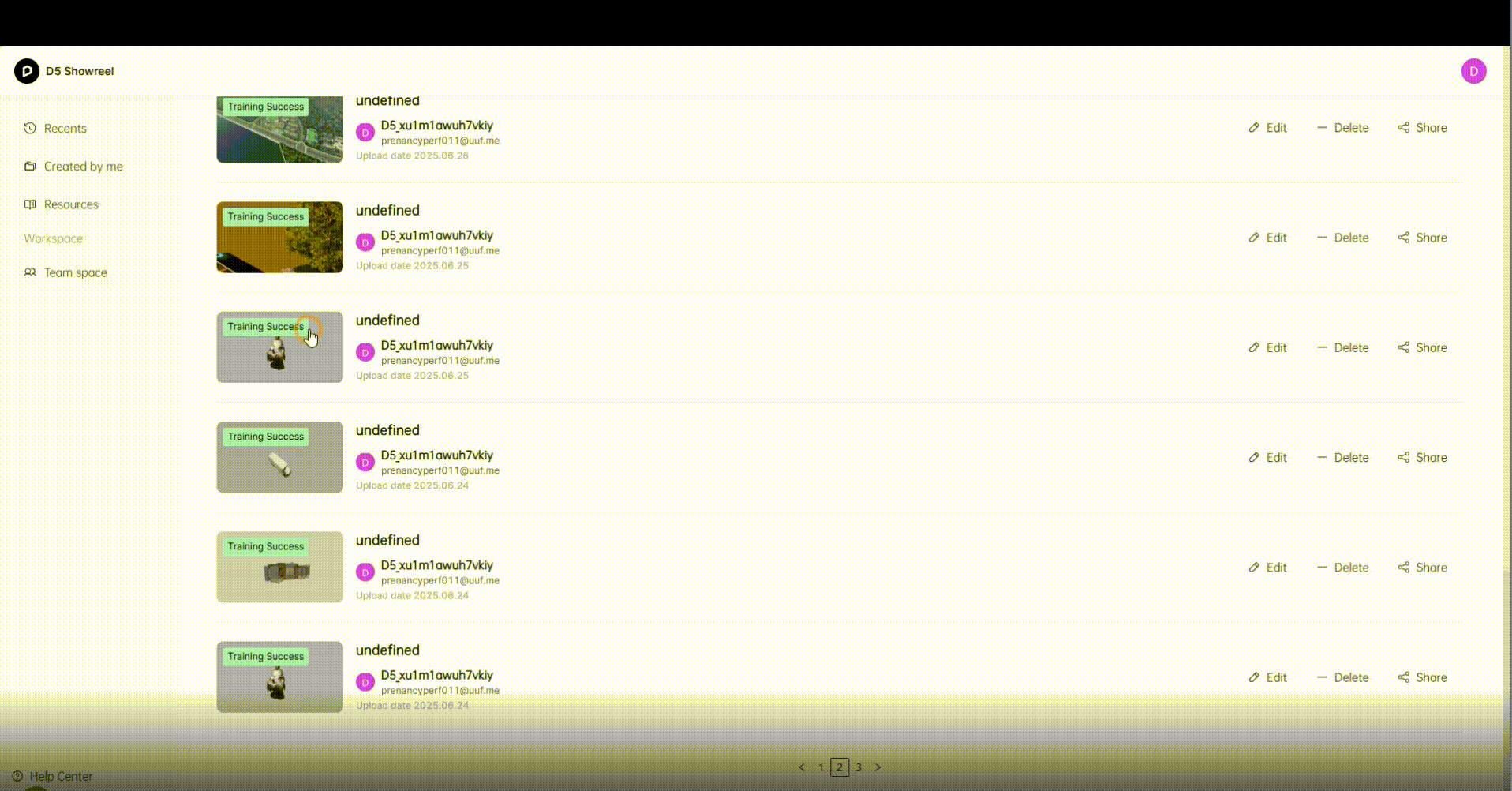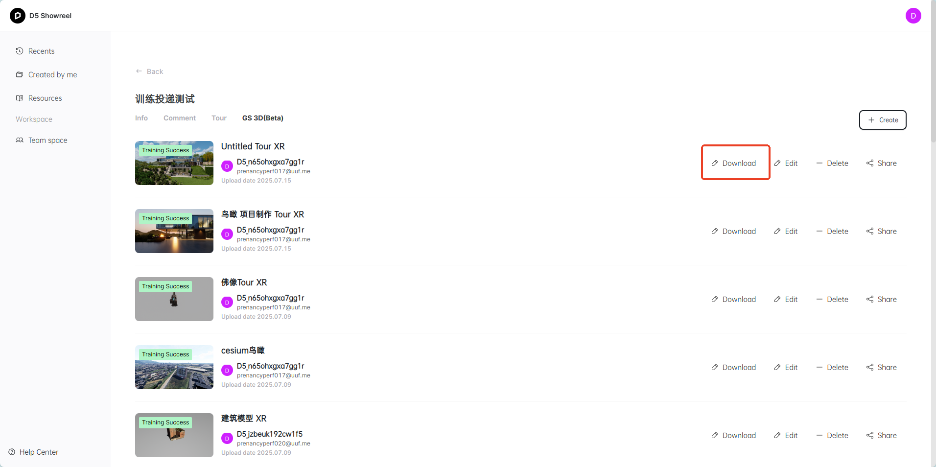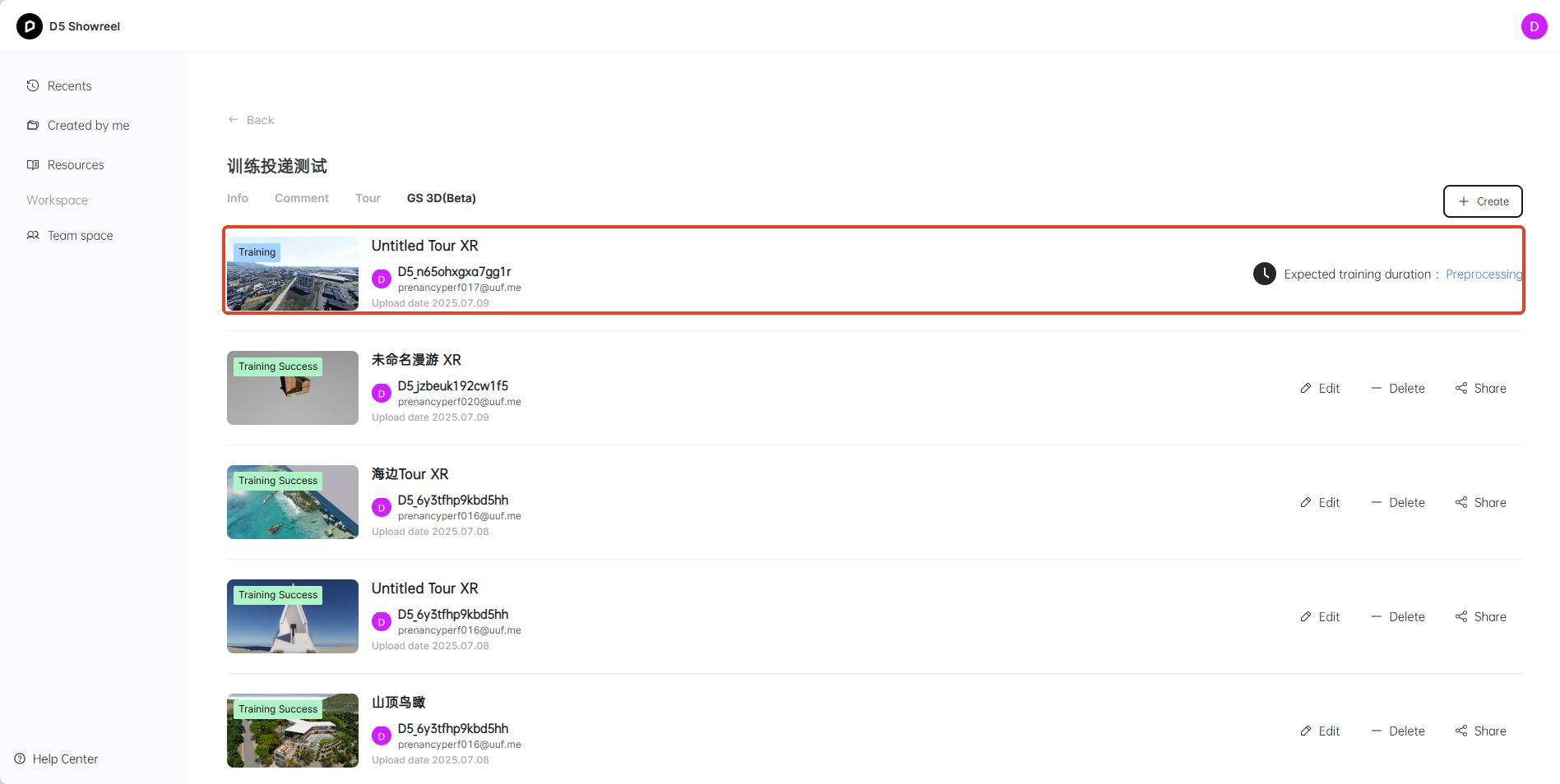 6. 在本地完成渲染后,就可以一键上传到D5 Showreel平台发起一个 3D Gaussian Splatting 的训练投递,训练完成后,系统会自动发送邮件提示用户查看训练结果。