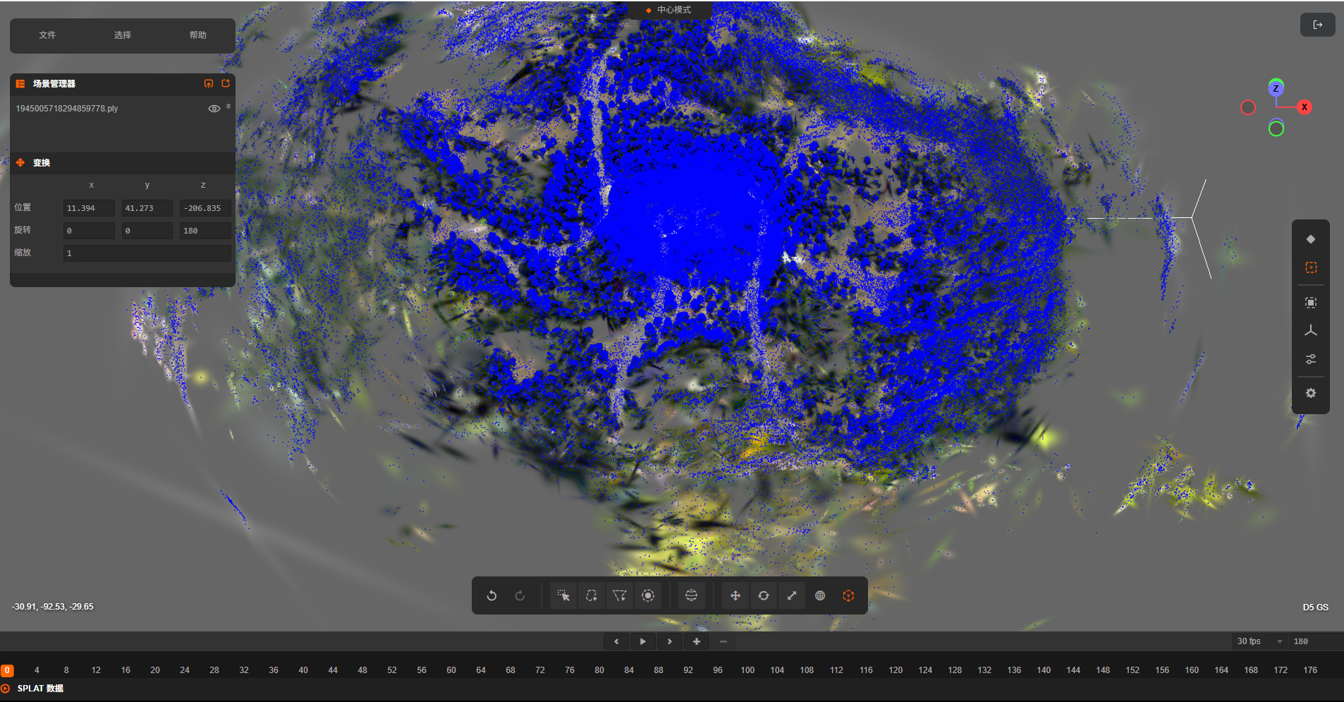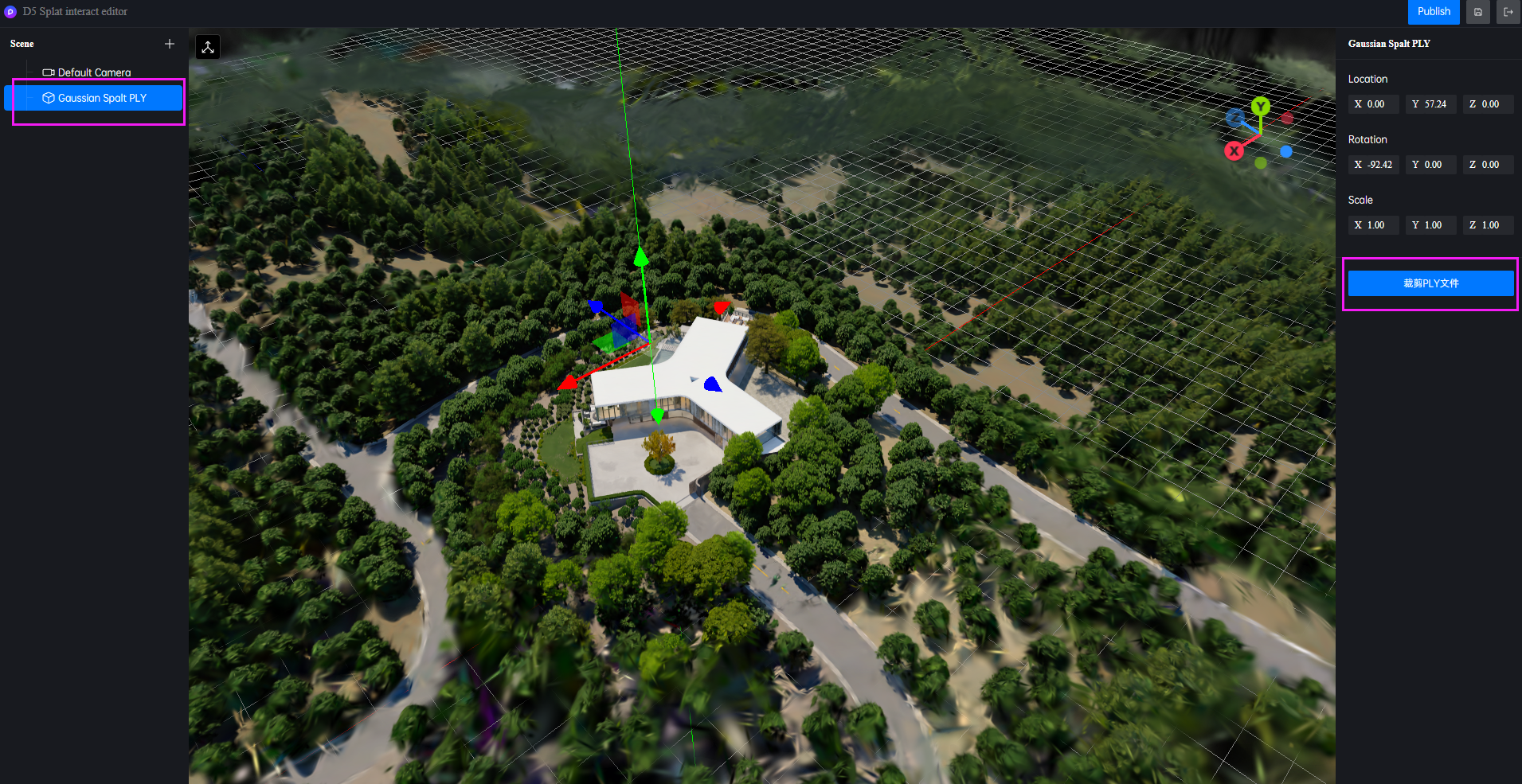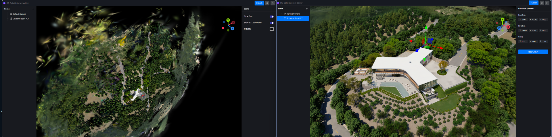 - 刚刚完成训练后,ply的初始角度很有可能与编辑器的世界坐标不匹配,需要用户选中ply文件后,手动旋转ply文件的角度和编辑器的世界坐标系对齐(可参考场景中的网格平面)