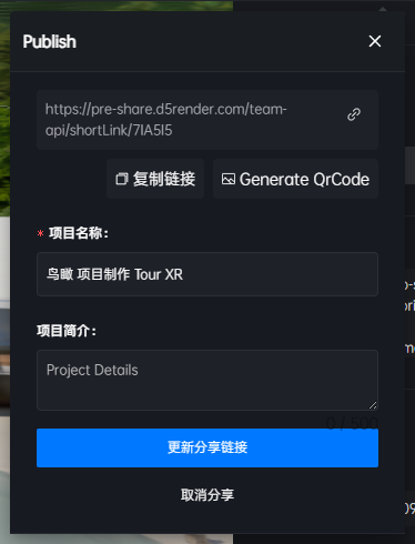 在完成发布后,系统会生成分享链接,分享链接中的默认初始视角,会取当前交互编辑器中3d界面中最后一次保存的视角。如果用户在发布过分享连接后,想更新项目(比如裁剪了之前的ply文件),必须重新点击【更新链接】,否则之前分享的联系中的文件仍然是旧文件↓