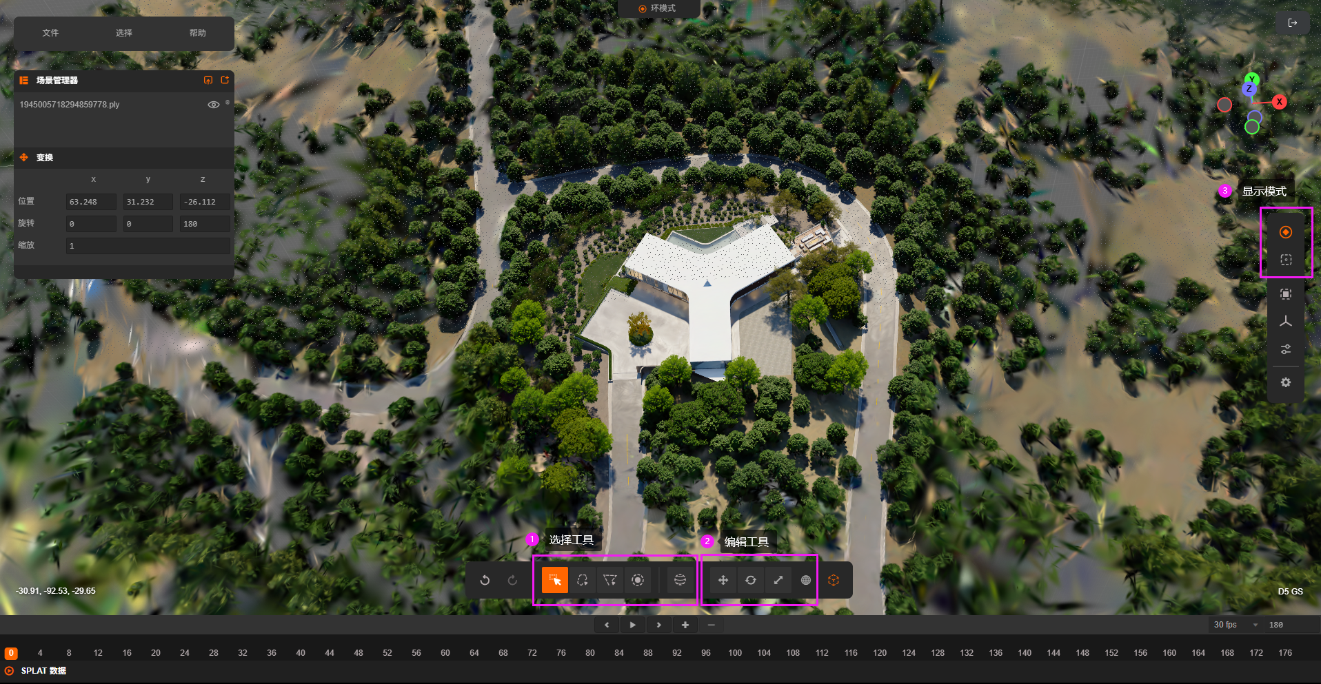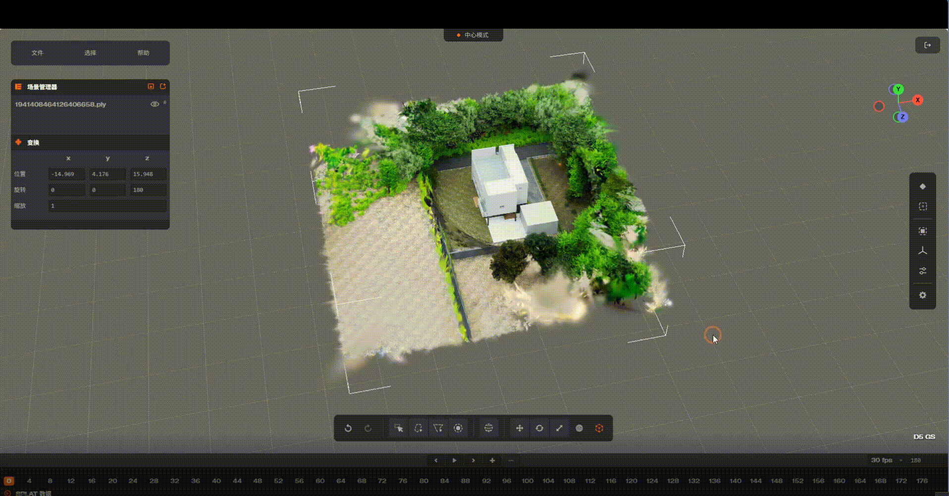 在场景中选择模型,右侧边栏点击“裁剪PLY文件”,进入模型编辑模式。