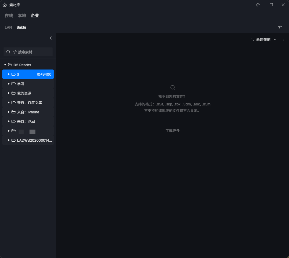 目前D5客户端仅支持显示您的百度网盘账户中的五种格式的文件:skp、fbx、d5a、3dm、abc、d5m。除此之外的文件,在D5客户端打开Baidu时是不会显示的。