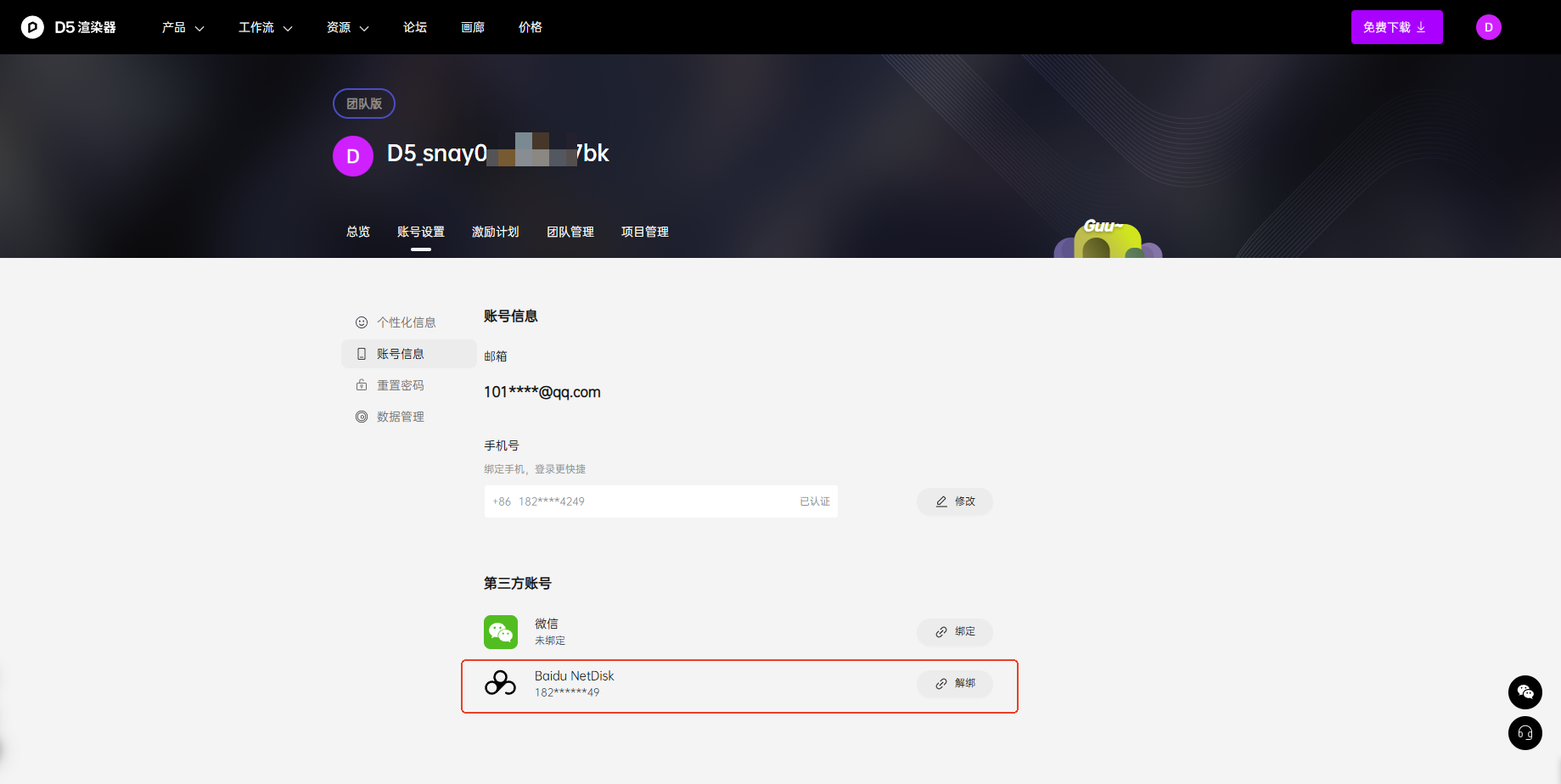 通过授权您的百度网盘账户,您可以直接将自己的百度网盘账户中的模型直接下载并导入到当前的D5项目中供自己使用;也可以将D5场景中的模型反向上传到自己的百度网盘账户中。