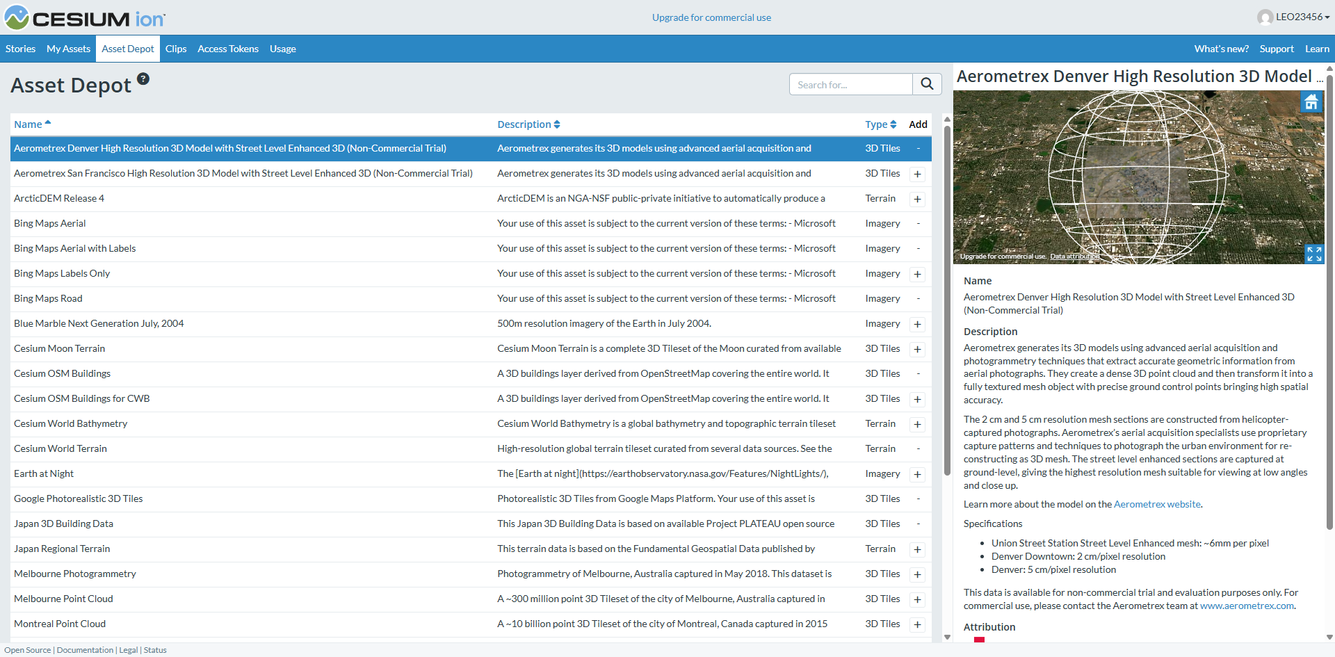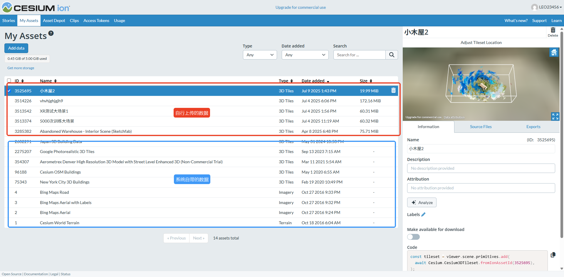 2. 访问后台→My asset,这个页面中会显示该账号所有可使用的【GIS数据源】,用户可以自己上传自己的模型数据或者测绘数据(中国大陆地区谨慎操作上传),也可以在Asset Depot中添加更多官方自带的GIS数据。*再次提醒,如果使用Cesium进行商业用途,必须购买Cesium的授权订阅