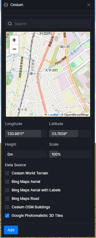 2. 打开CESIUM插件,通过地图组件或者直接输入项目所在地的经纬度坐标,CESIUM插件会以当前经纬度为中心点创建一个【地理锚点】,然后用户需要勾选在这个【地理锚点】D5场景中加载那些类型的数据源。