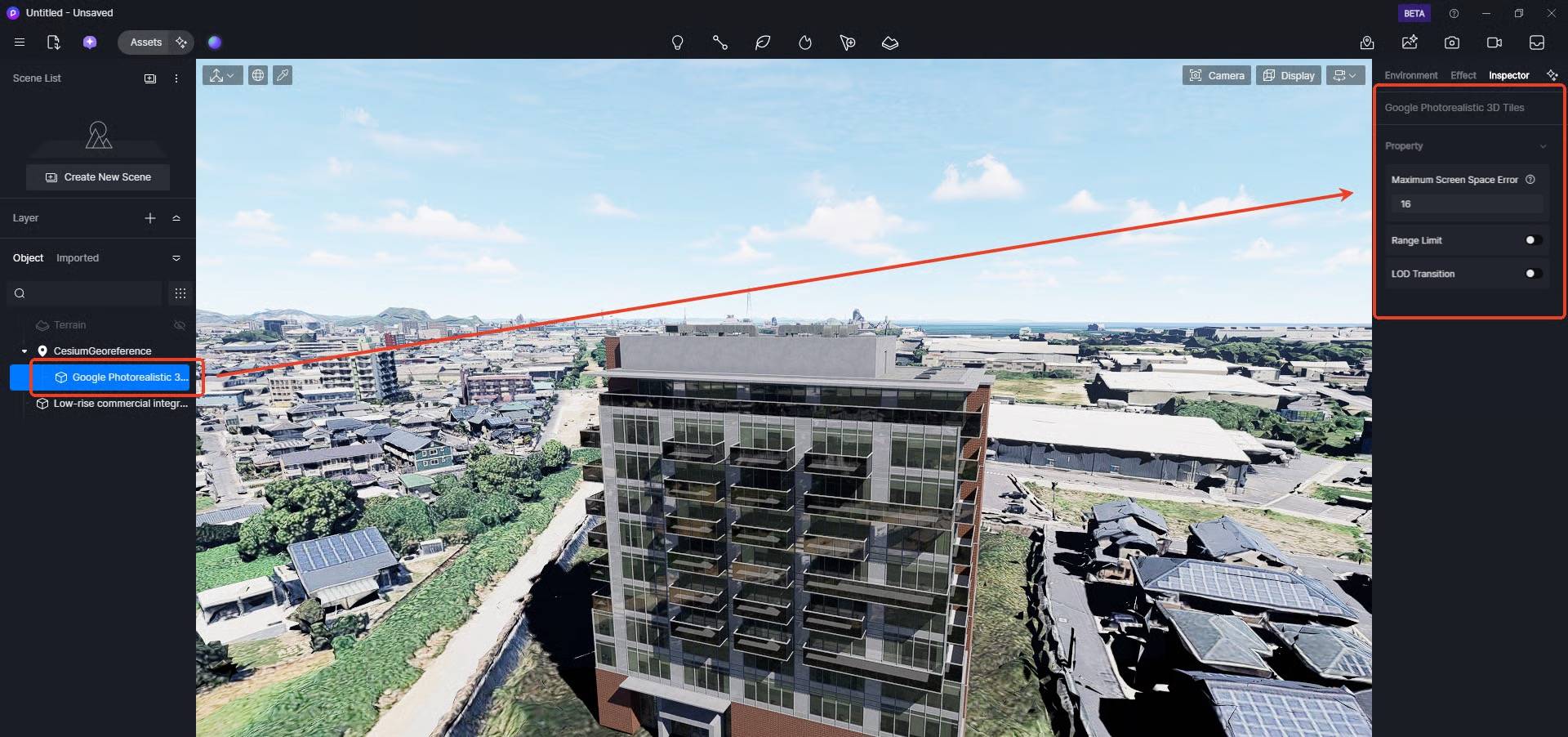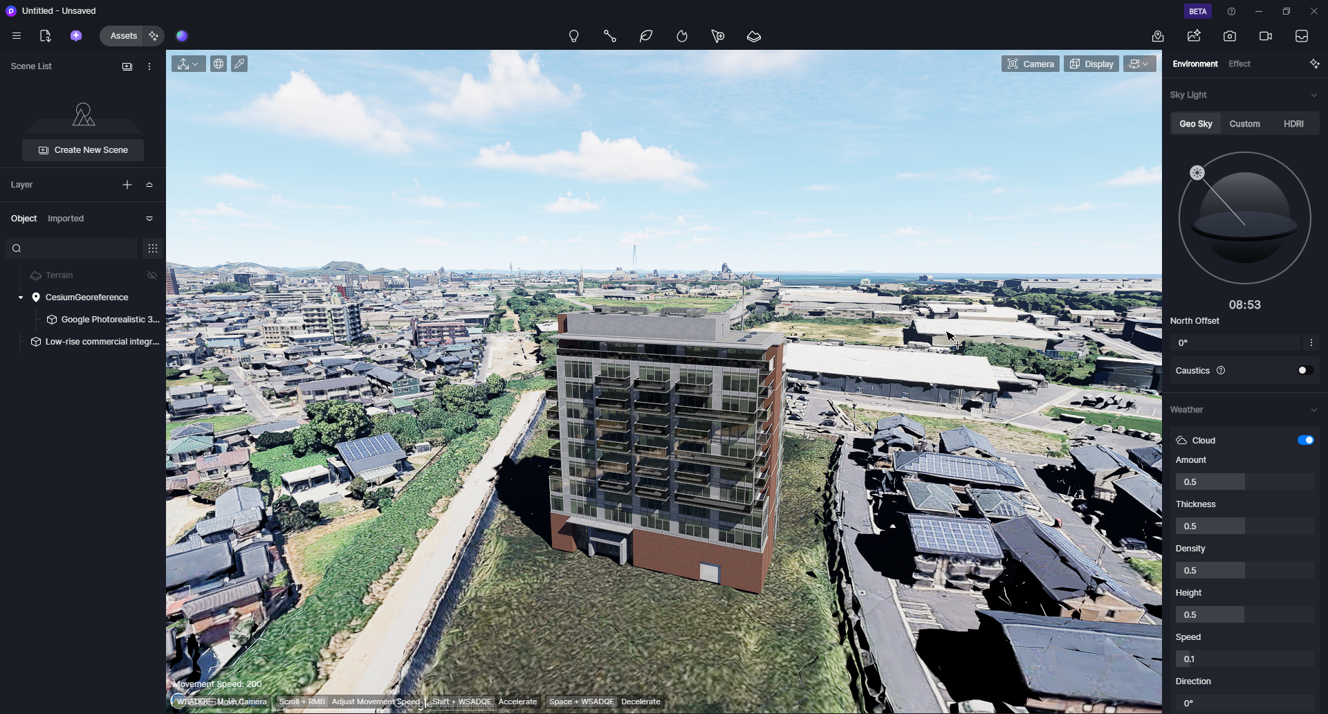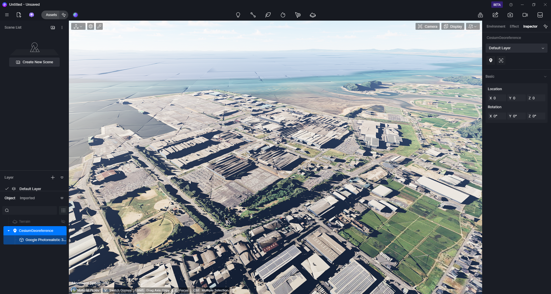 *由于必须从网络加载资源,并且资源加载过程是渐进式的,因此一开始可能场景中会有一段时间等待数据加载的空白时间。建议隐藏或删除D5场景中的默认地形,然后将相机的高度调高,等待数据加载