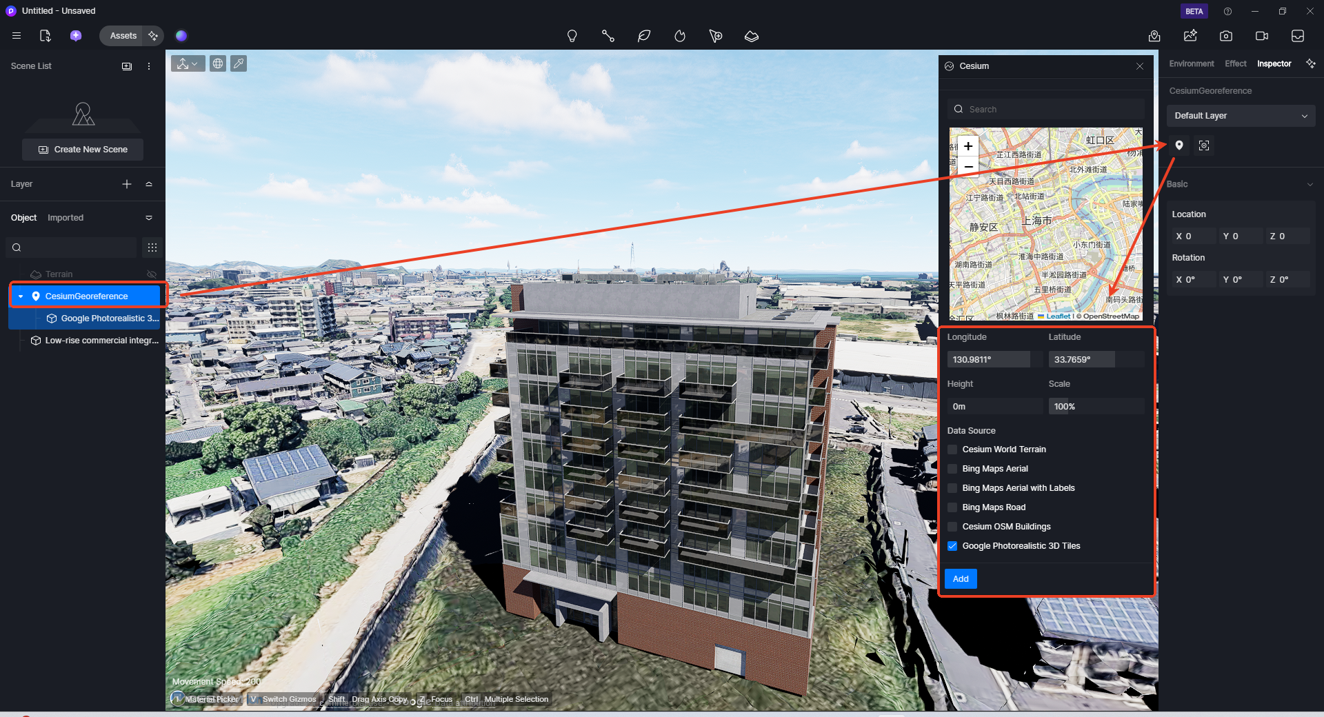 3. 点击【添加】,一个树状结构的地理信息锚点就会被添加到场景资源列表中
