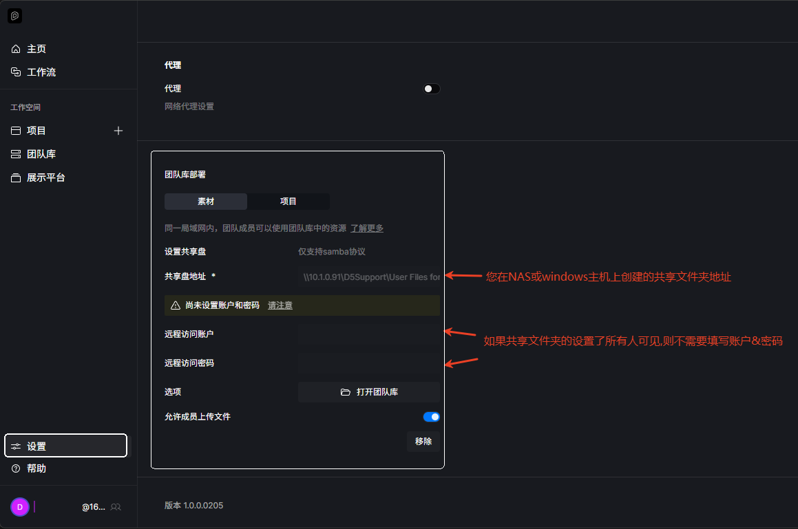 D5目前能够连接Samba协议的共享盘,在D5客户端中配置对应的共享盘地址、访问账户和密码,即可在局域网中使用企业库。