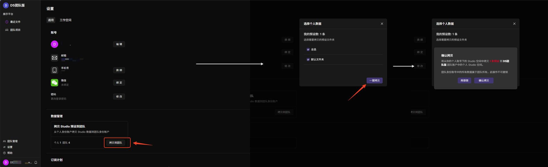 在团队账户的个人中心(myspace)>数据管理中,支持将同一D5账号的个人身份下的Studio空间中的预设【一键拷贝】到其团队身份下的Studio个人空间中。