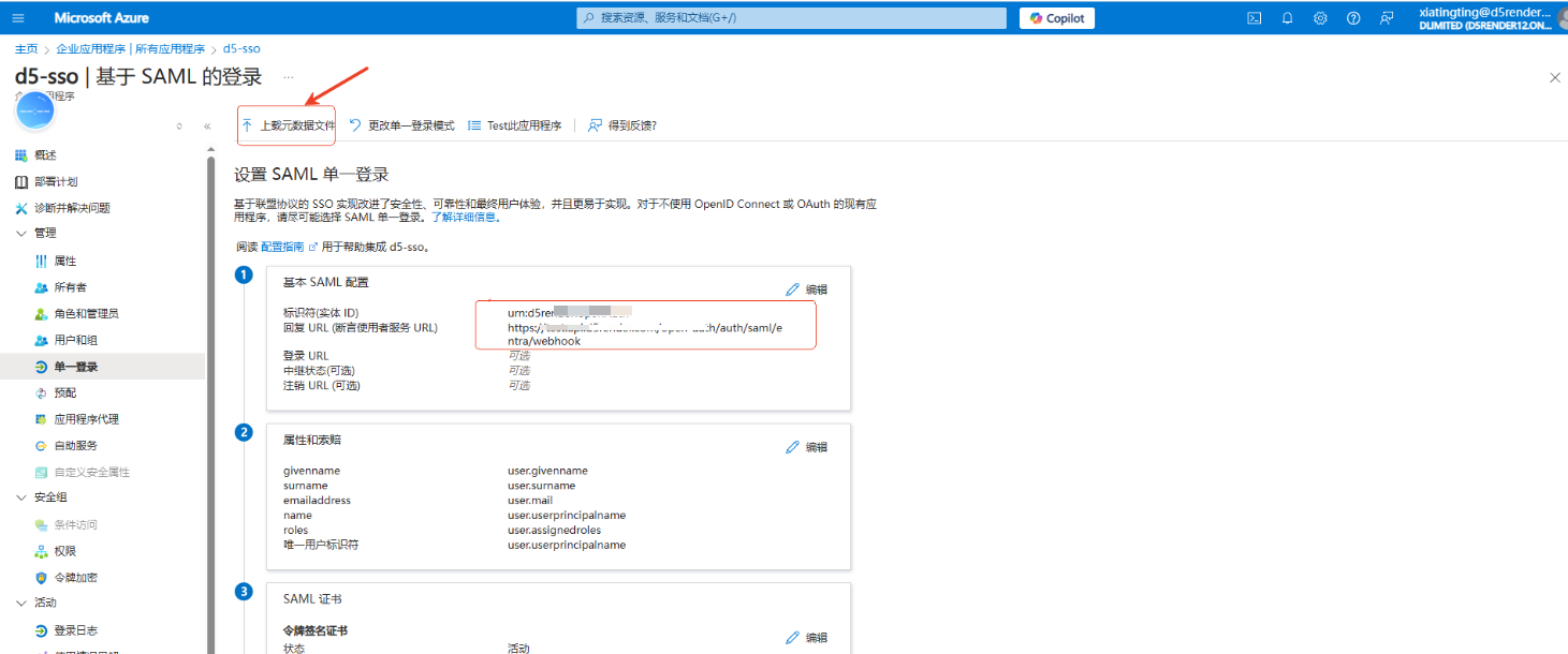 - 点击 “上传元数据文件”,导入下载的 XML 文件