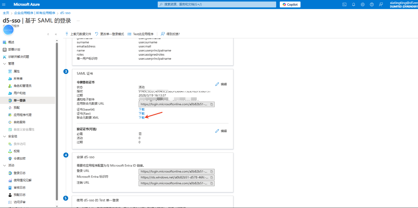 - 找到 SAML 证书 区域,下载 “联合元数据 XML”