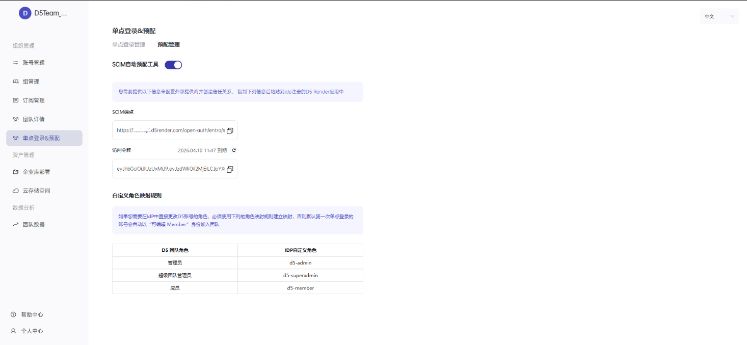 进入 D5 团队管理后台,启用自动预配,获取相关配置项(如访问令牌)