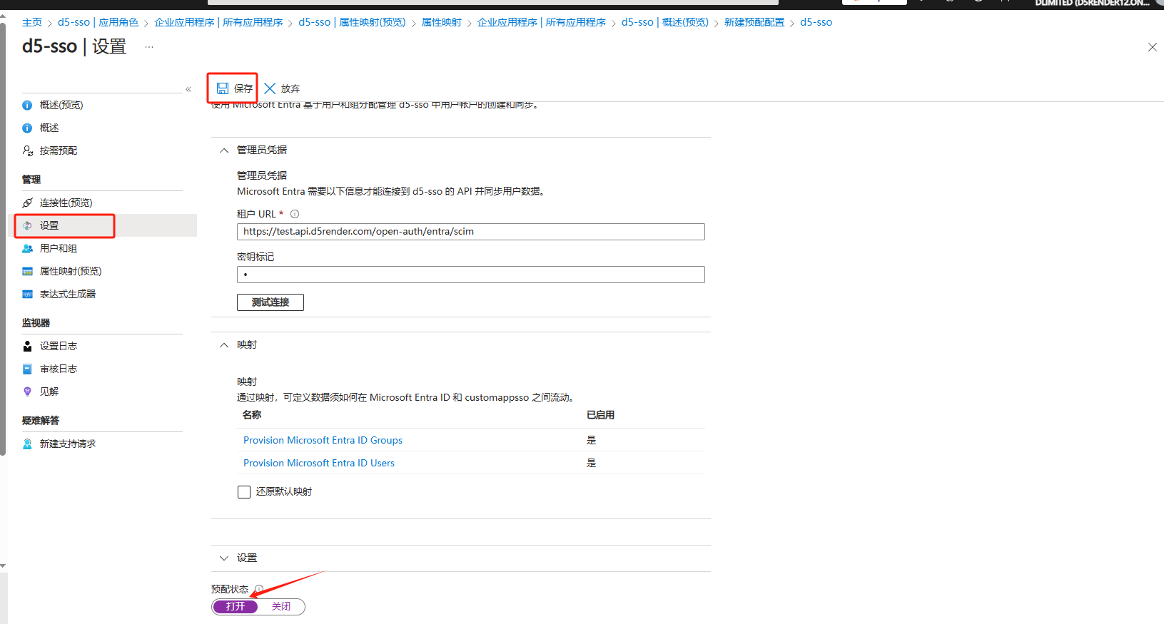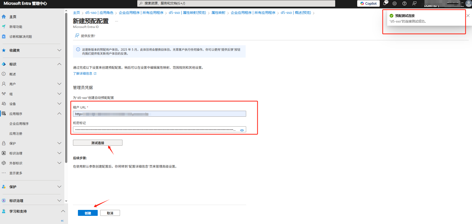 - 输入从 D5 团队管理后台获取的 SCIM端点 和 访问令牌(Access Token),点击测试连接,提示测试成功后,点击"创建"