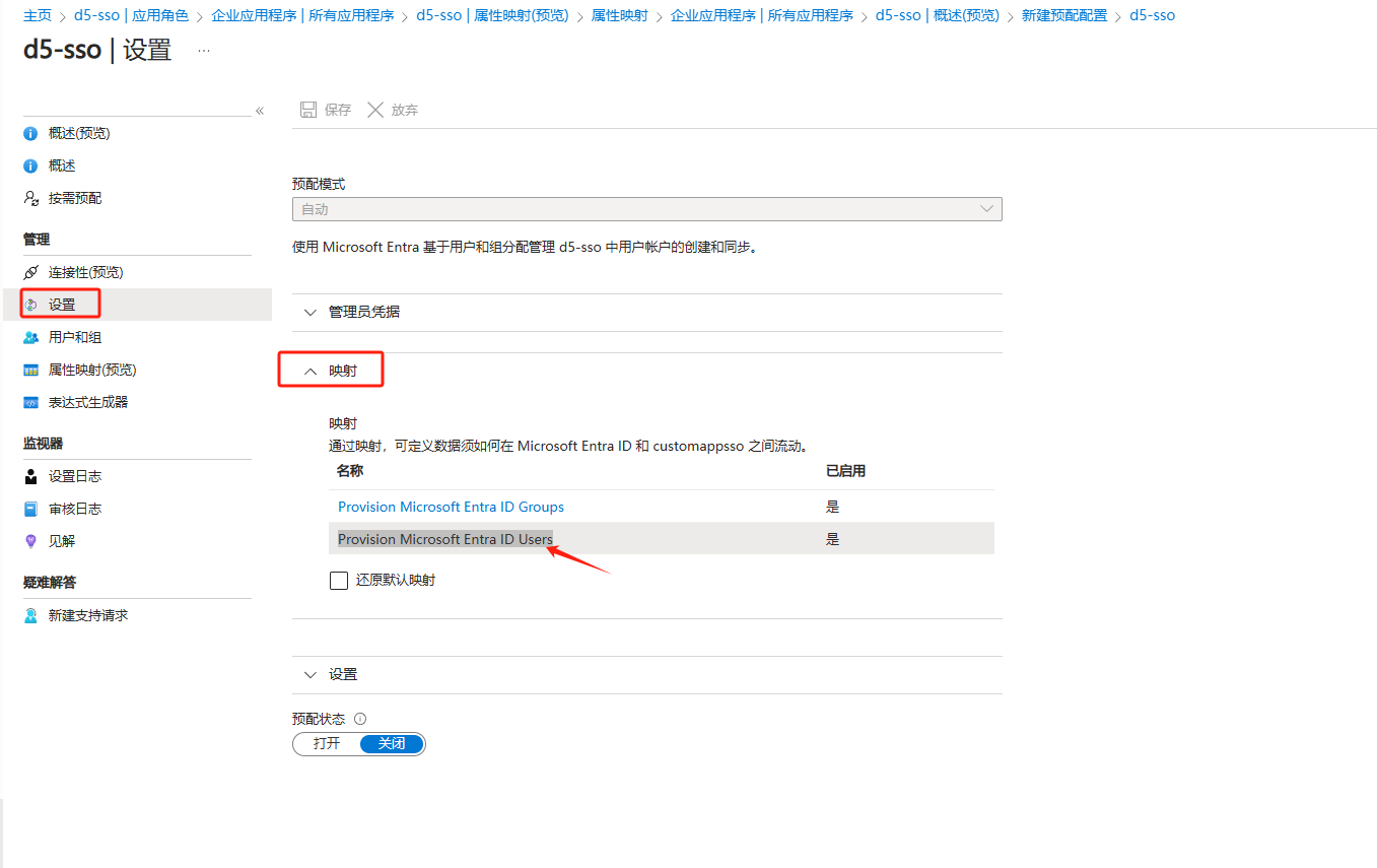 - 点击映射,选择“Provision Microsoft Entra ID Users”