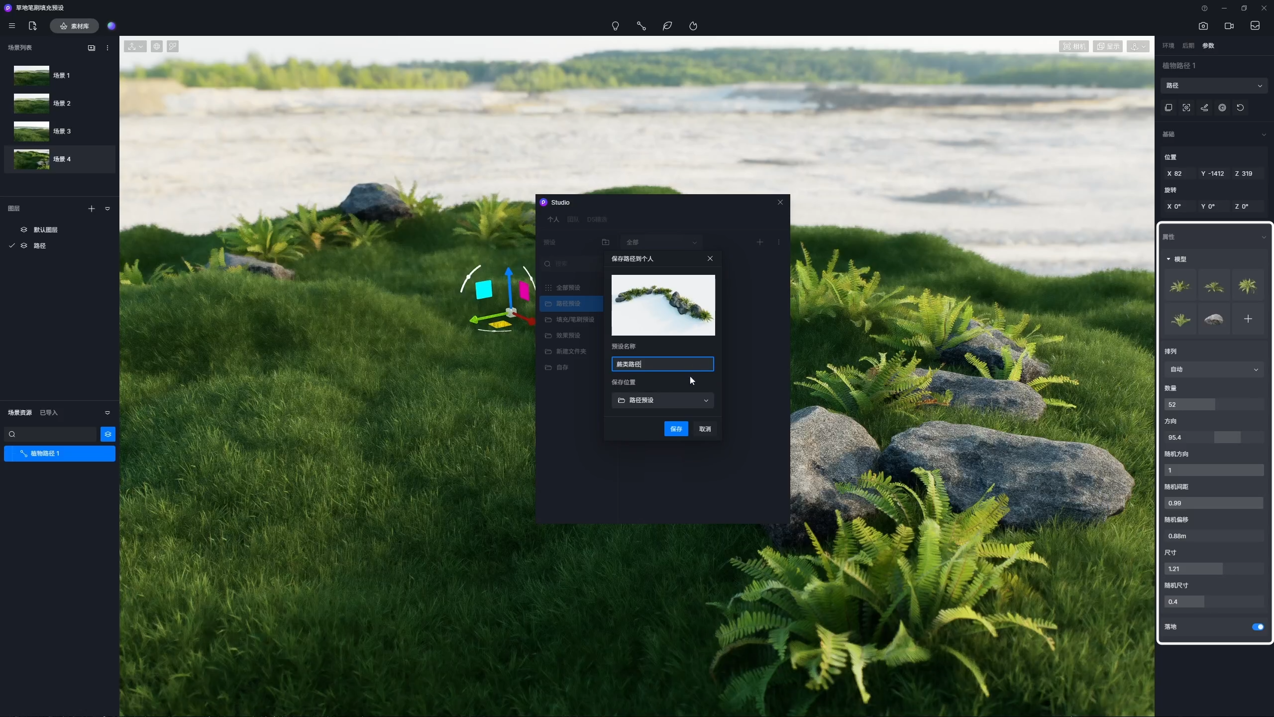 在场景或资源列表中选中对应的路径,在路径工具的右侧边栏中点击“创建预设”的按钮,即可记录当前路径上的参数。